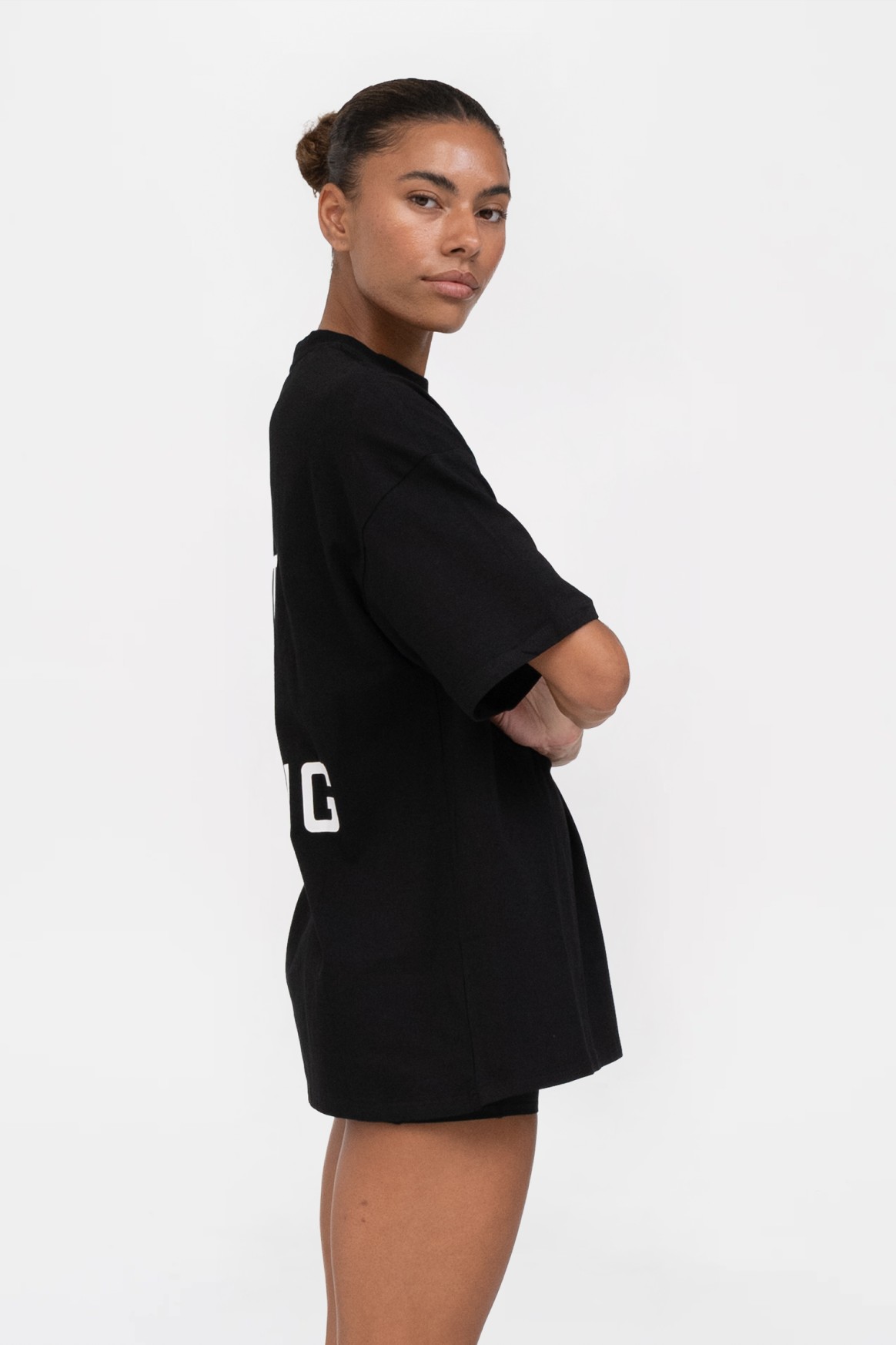 We Don't Play Boxing 오버사이즈 티셔츠가 트레이닝이나 일상복으로 모두 착용 가능하며 편안함과 실용성을 제공하는 동시에 복싱은 결코 게임이 아니라는 메시지를 명확하게 전달합니다.