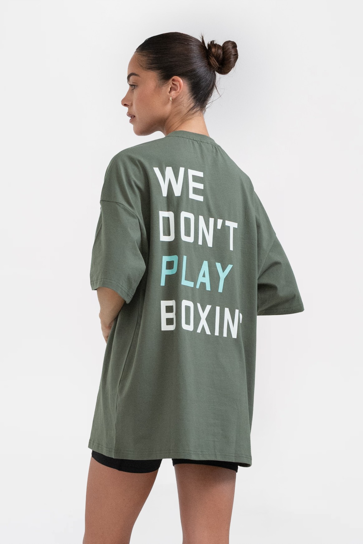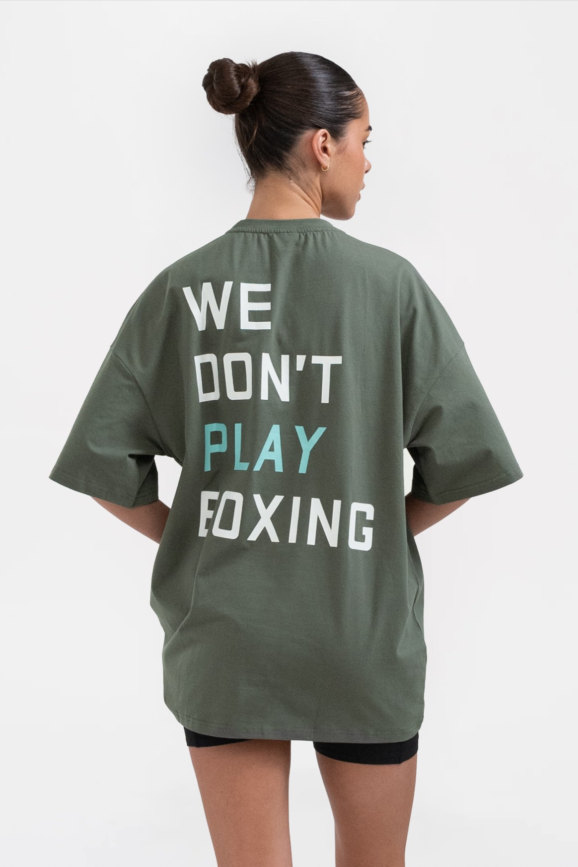 We Don't Play Boxing 오버사이즈 티셔츠가 트레이닝이나 일상복으로 모두 착용 가능하며 편안함과 실용성을 제공하는 동시에 복싱은 결코 게임이 아니라는 메시지를 명확하게 전달합니다.