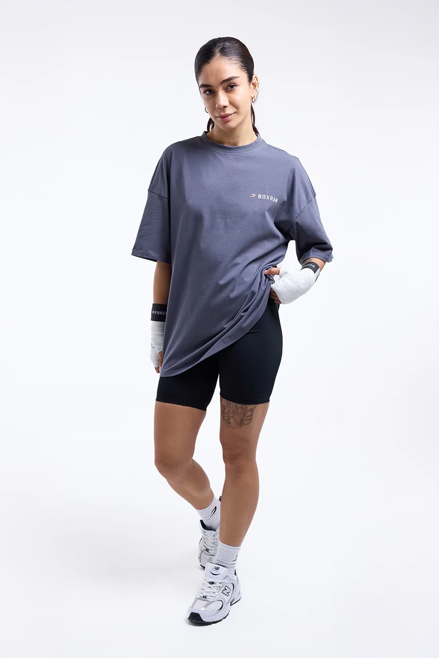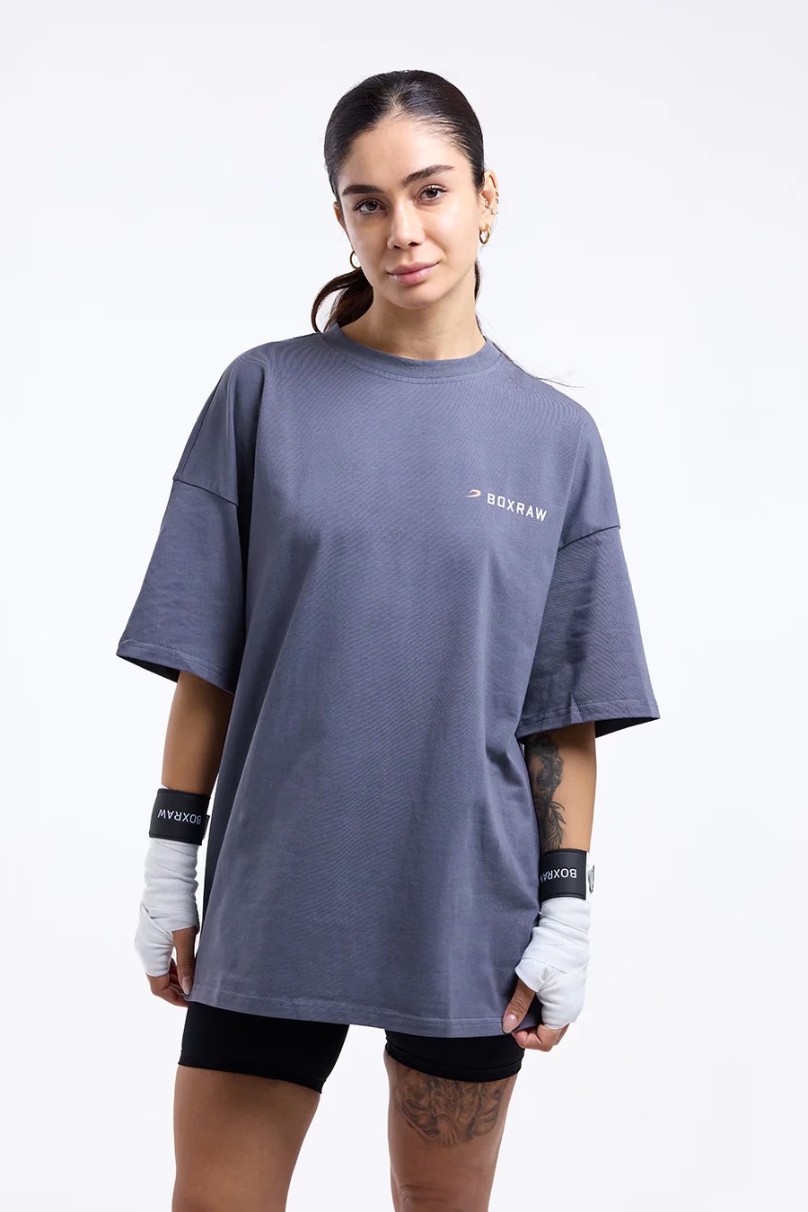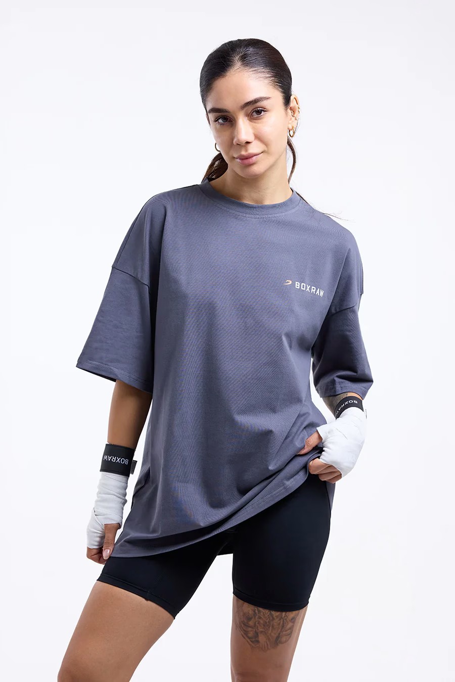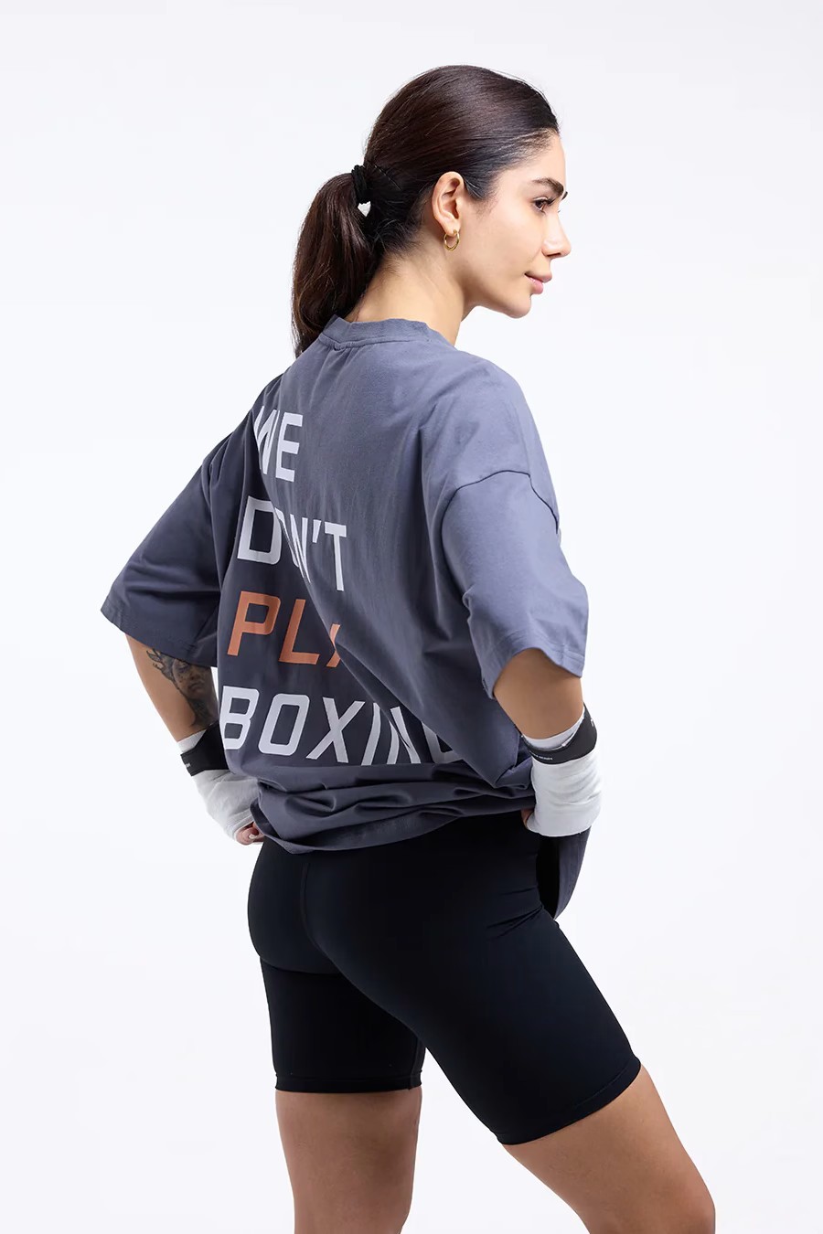 We Don't Play Boxing 오버사이즈 티셔츠가 트레이닝이나 일상복으로 모두 착용 가능하며 편안함과 실용성을 제공하는 동시에 복싱은 결코 게임이 아니라는 메시지를 명확하게 전달합니다.