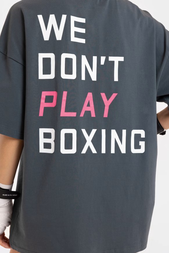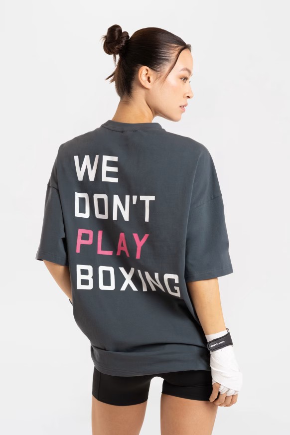 We Don't Play Boxing 오버사이즈 티셔츠가 트레이닝이나 일상복으로 모두 착용 가능하며 편안함과 실용성을 제공하는 동시에 복싱은 결코 게임이 아니라는 메시지를 명확하게 전달합니다.