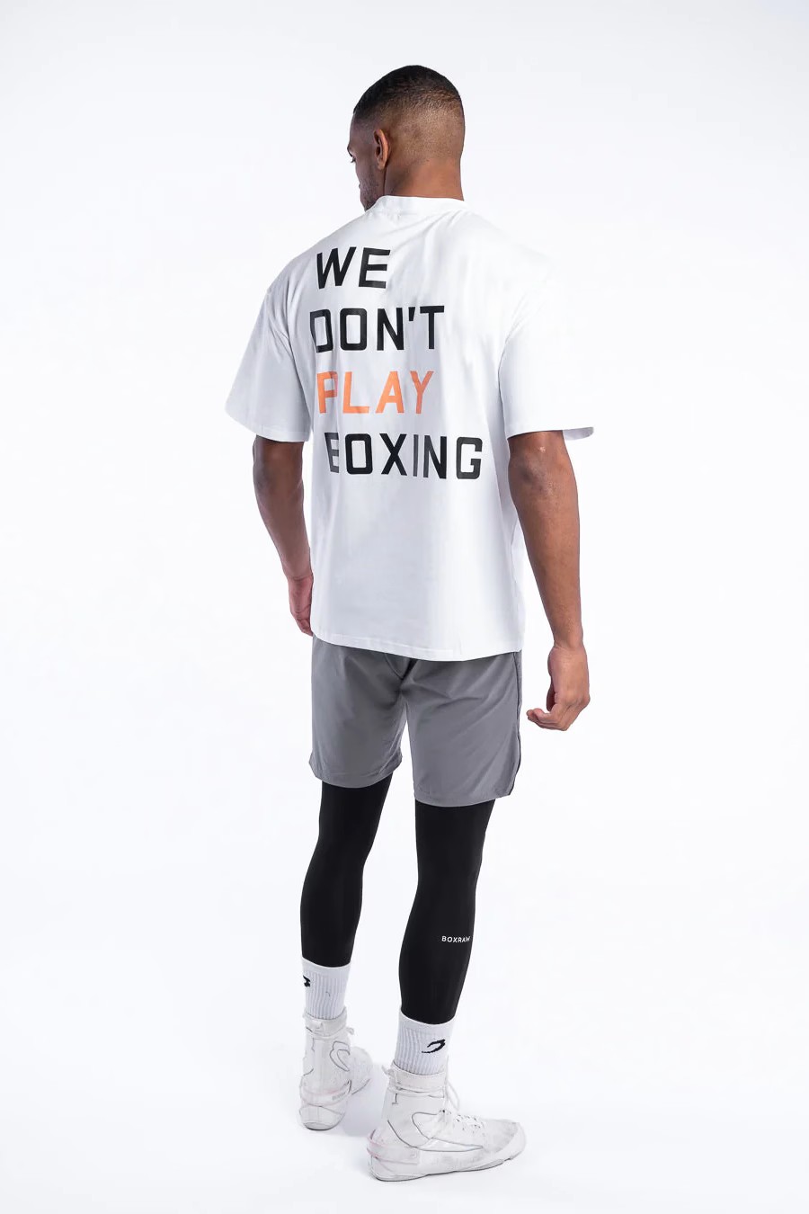 We Don't Play Boxing 오버사이즈 티셔츠가 트레이닝이나 일상복으로 모두 착용 가능하며 편안함과 실용성을 제공하는 동시에 복싱은 결코 게임이 아니라는 메시지를 명확하게 전달합니다.