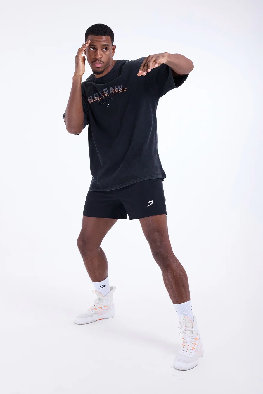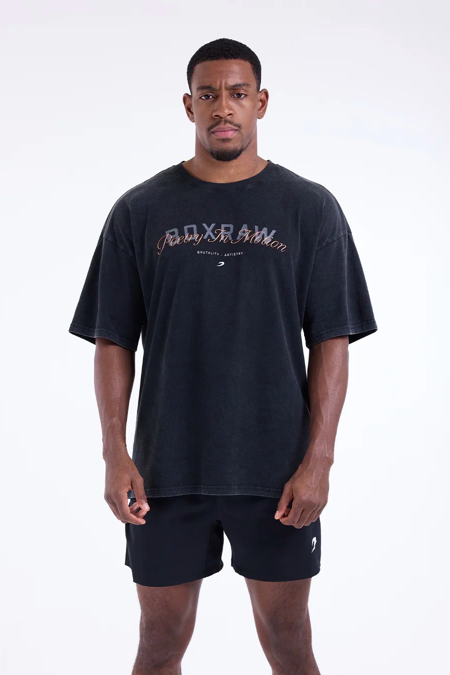 내구성 높은 신축성 코튼 소재로 제작된 이 오버사이즈 티셔츠는 등 부분에 'Brutality - Artistry'라는 시에서 따온 문구가 새겨져 있습니다.