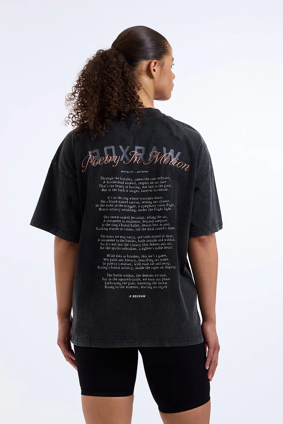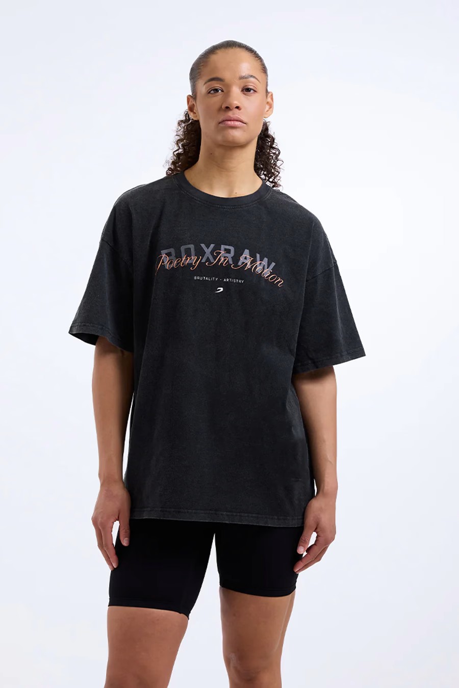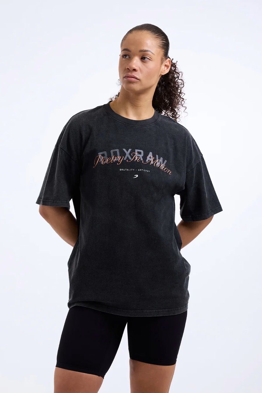 내구성 높은 신축성 코튼 소재로 제작된 이 오버사이즈 티셔츠는 등 부분에 'Brutality - Artistry'라는 시에서 따온 문구가 새겨져 있습니다.