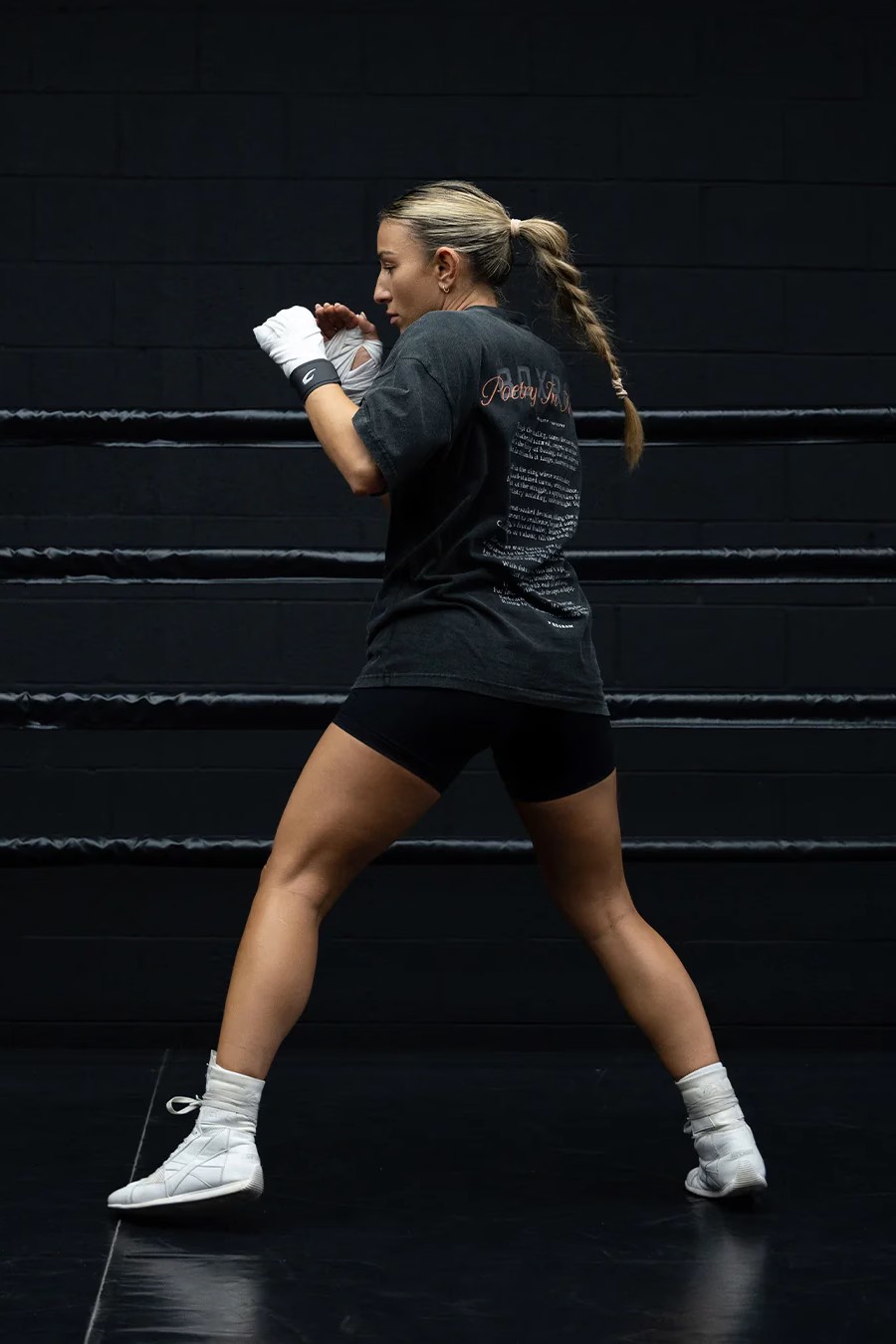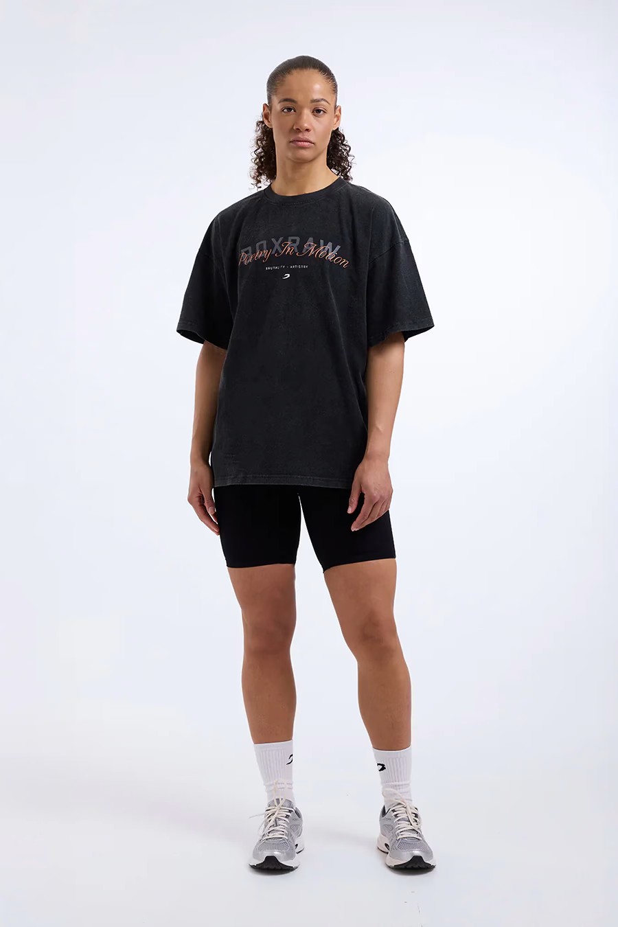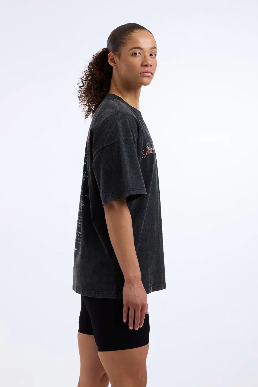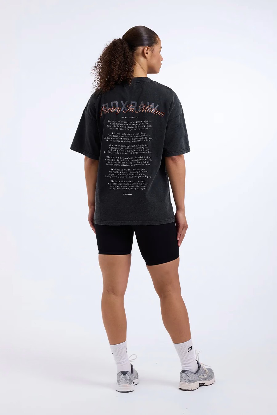 내구성 높은 신축성 코튼 소재로 제작된 이 오버사이즈 티셔츠는 등 부분에 'Brutality - Artistry'라는 시에서 따온 문구가 새겨져 있습니다.