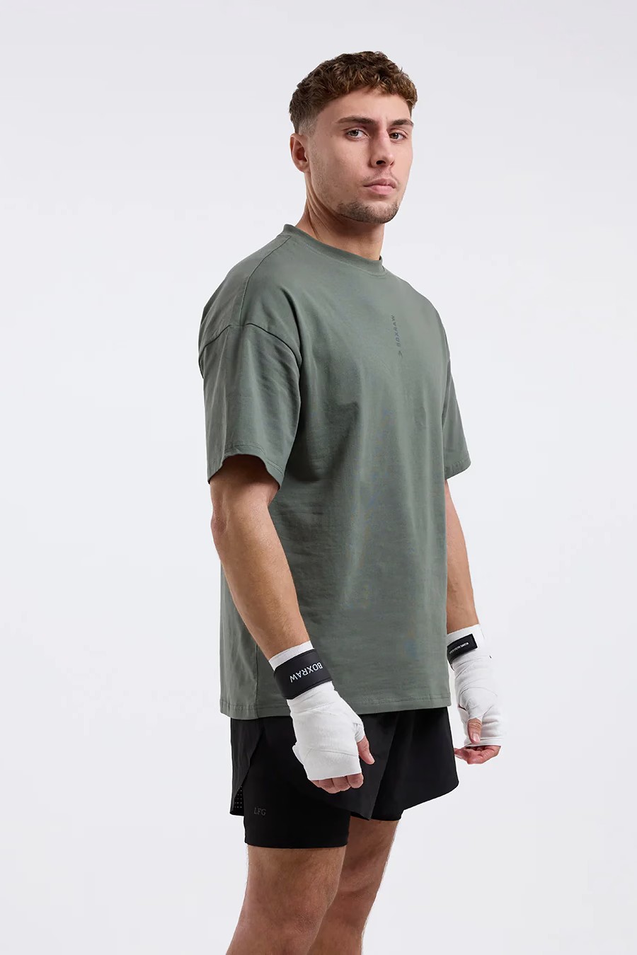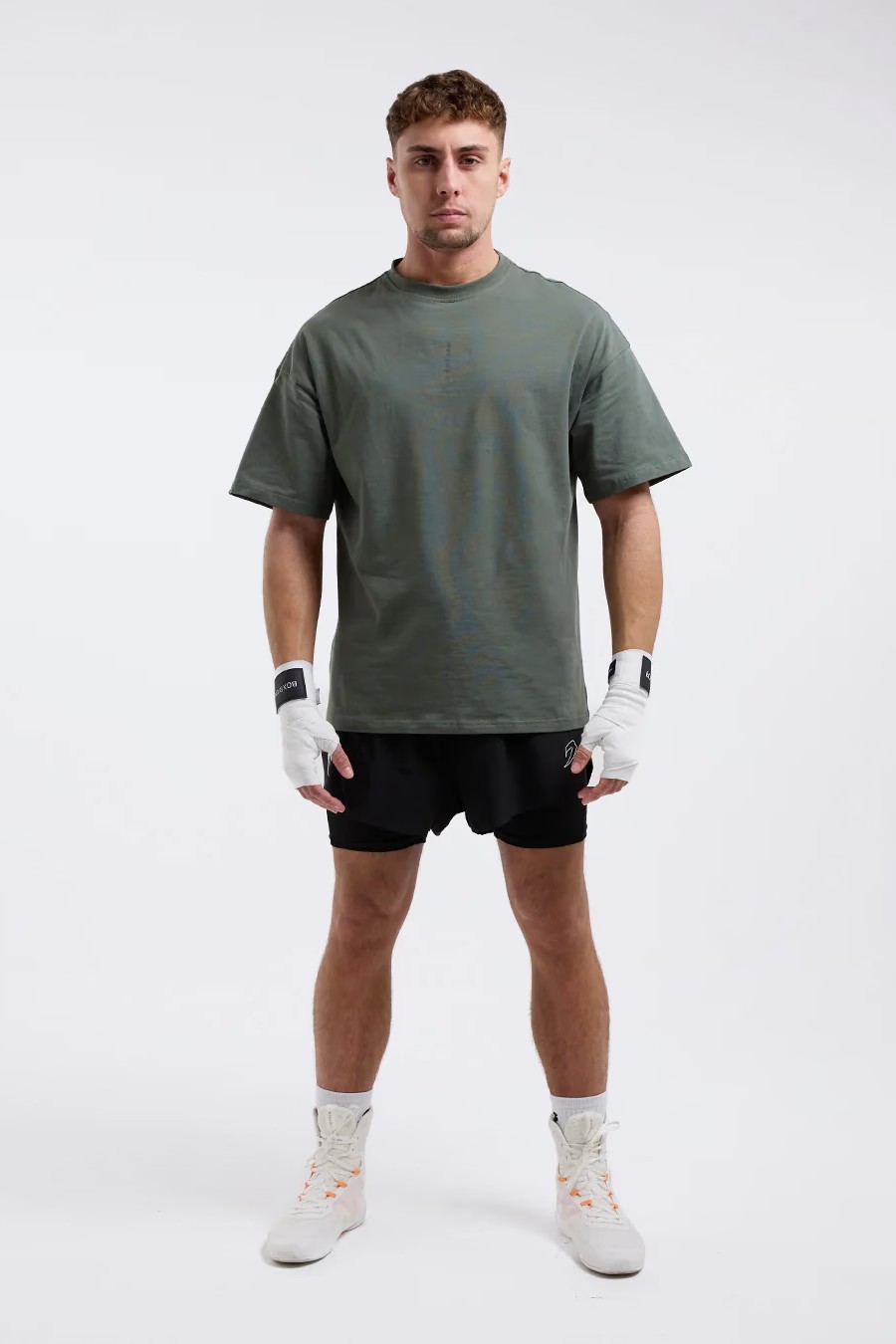 블랙 티셔츠를 착용한 모델: 조던 (아마추어 라이트헤비급 복서), 신장: 180cm, 모델 착용 사이즈: M