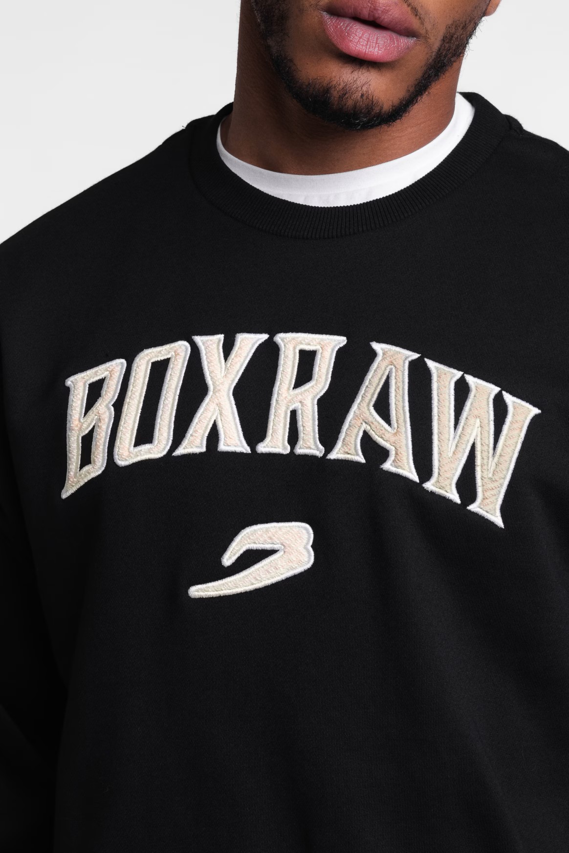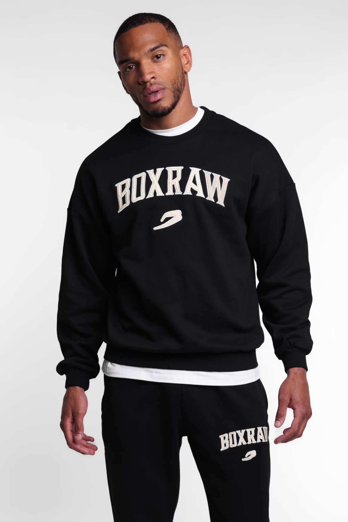 디스트레스드 그레이 스웻셔츠를 착용한 모델: 프랭키 (프로 웰터급 복서), 신장: 182cm, 모델 착용 사이즈: L