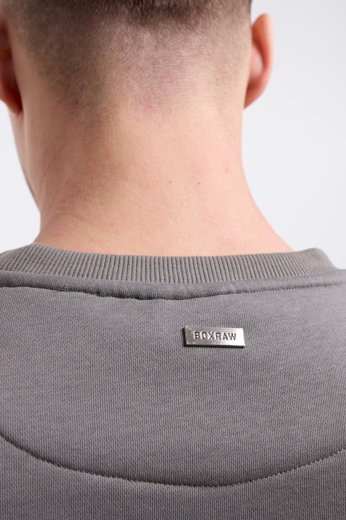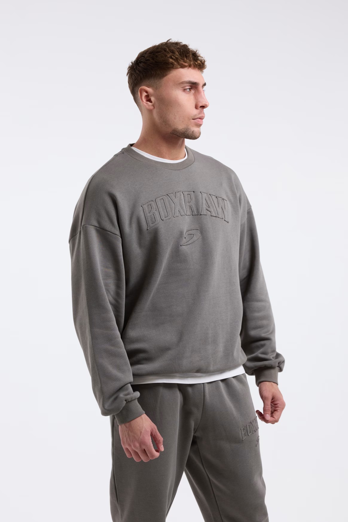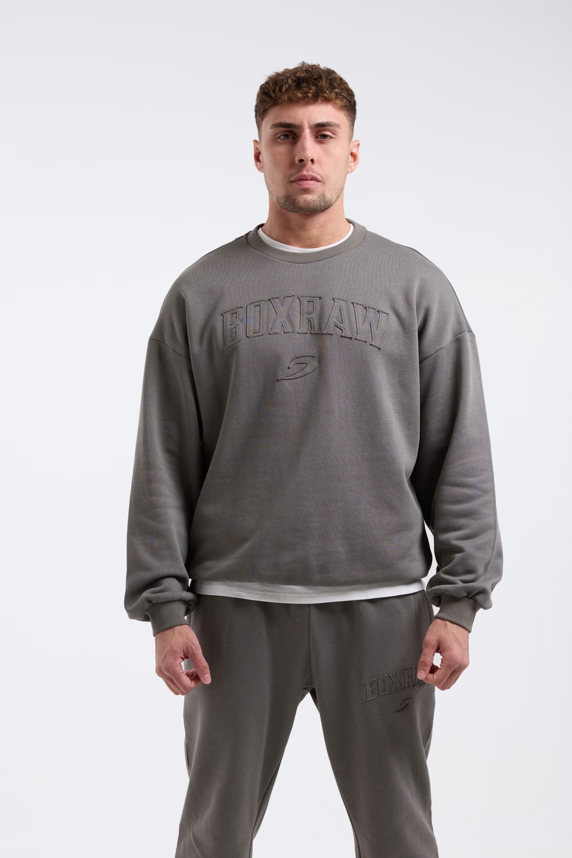 디스트레스드 그레이 스웻셔츠를 착용한 모델: 프랭키 (프로 웰터급 복서), 신장: 182cm, 모델 착용 사이즈: L