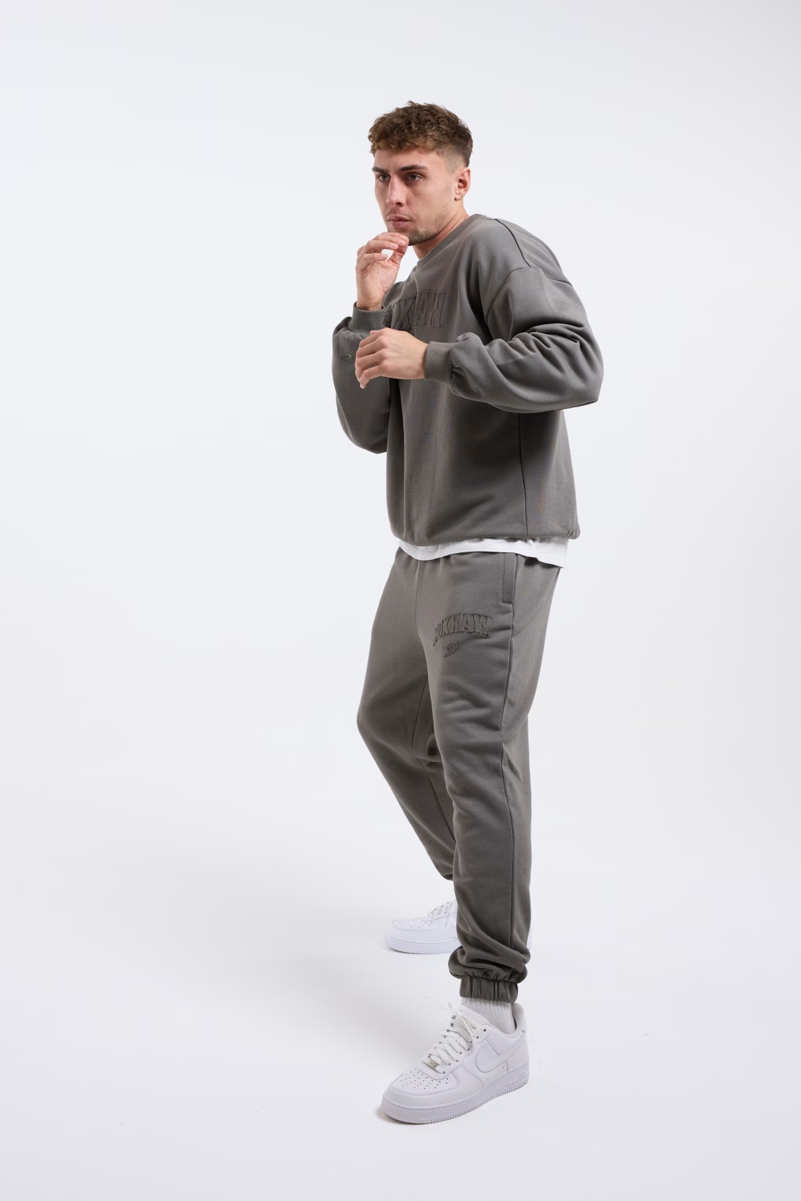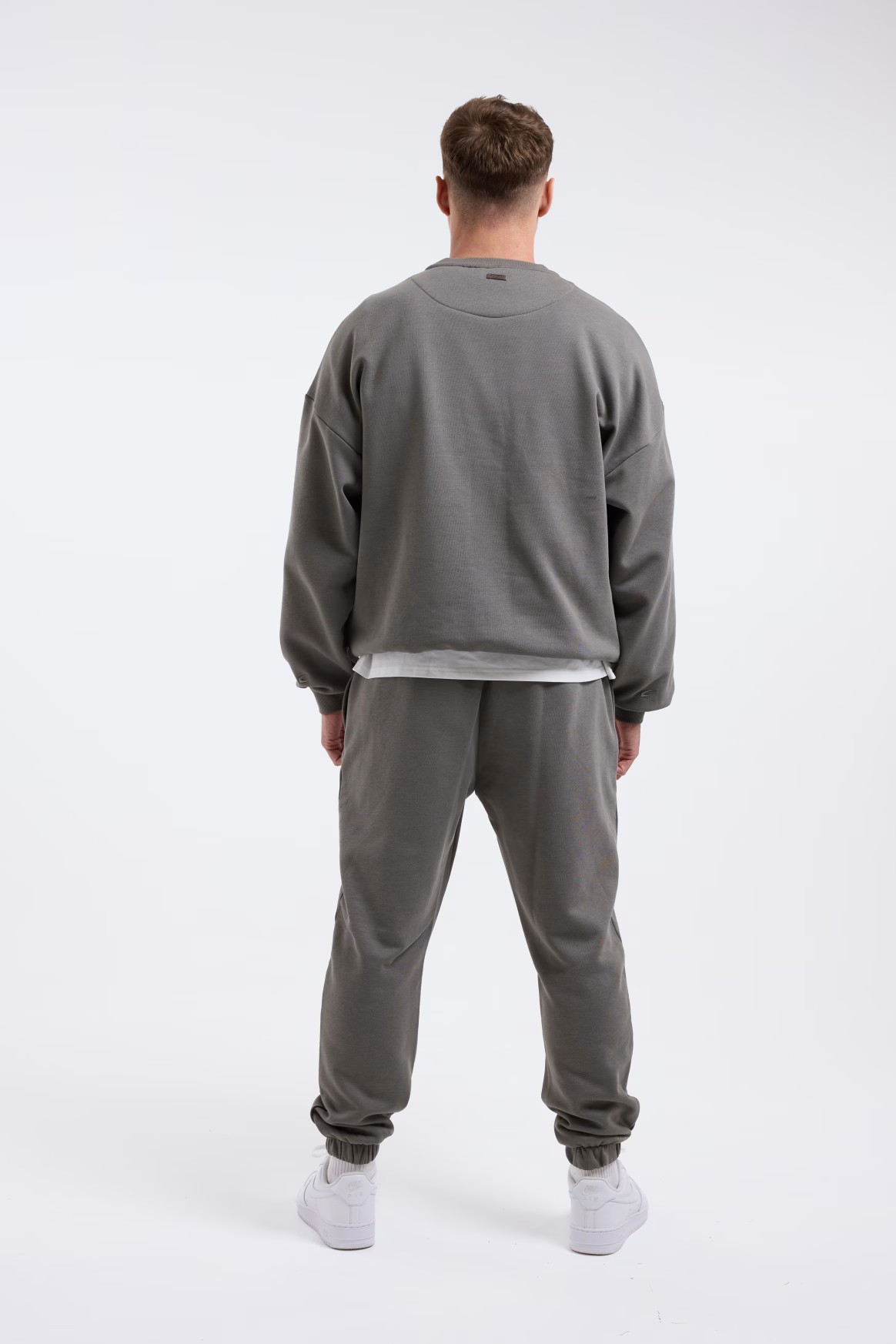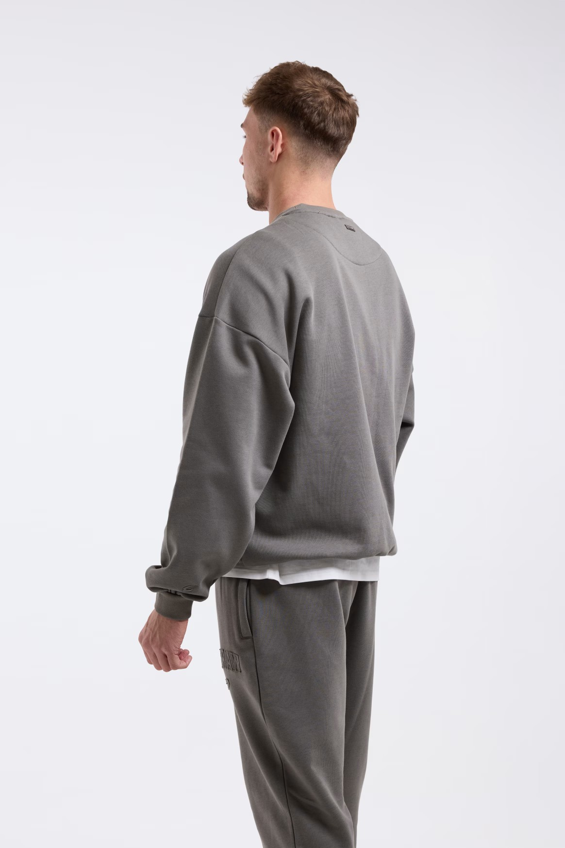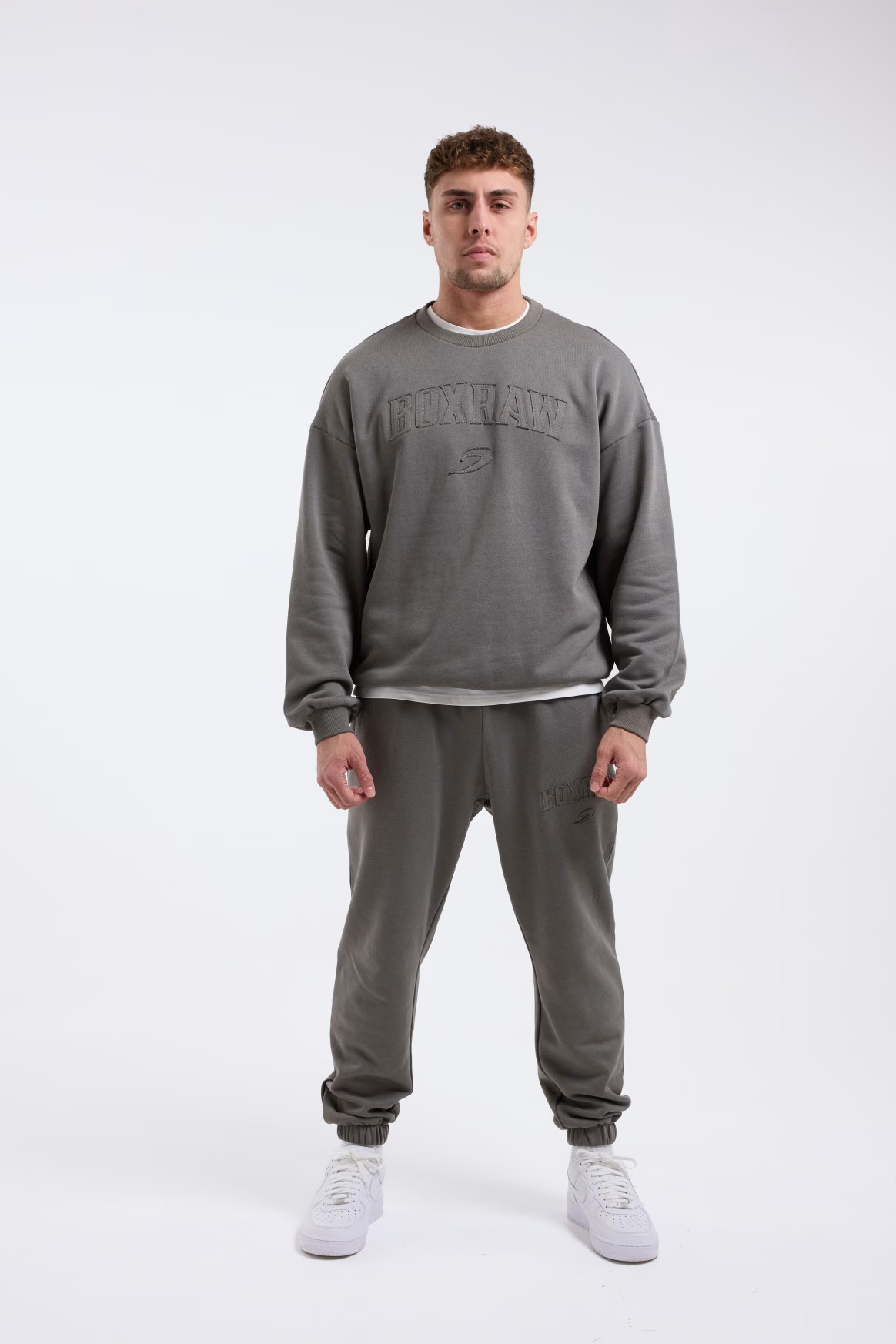 디스트레스드 그레이 스웻셔츠를 착용한 모델: 프랭키 (프로 웰터급 복서), 신장: 182cm, 모델 착용 사이즈: L
