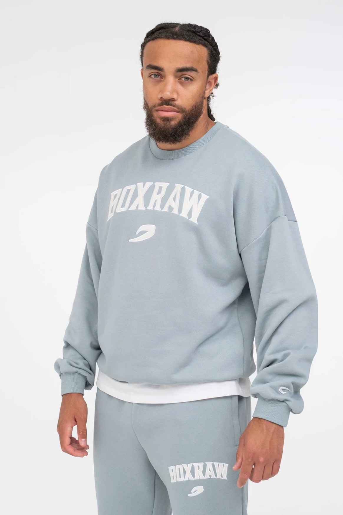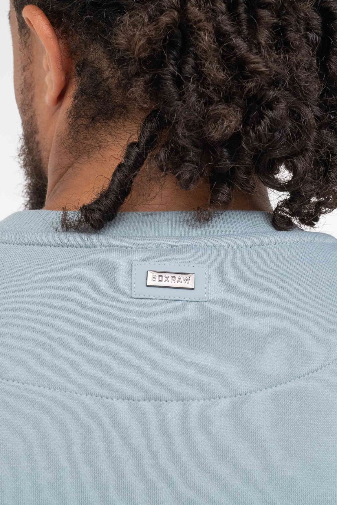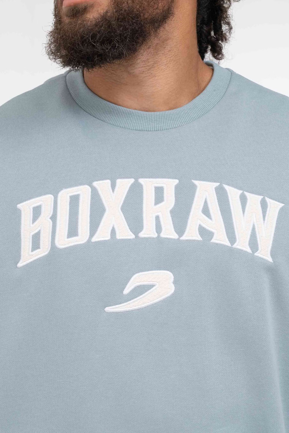 파우더 블루 스웻셔츠를 착용한 모델: CJ (프로 웰터급 복서), 신장: 180cm, 모델 착용 사이즈: M