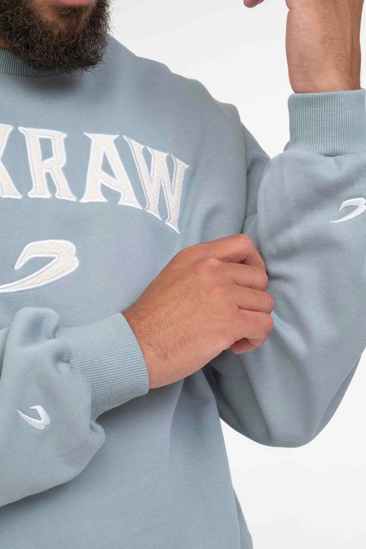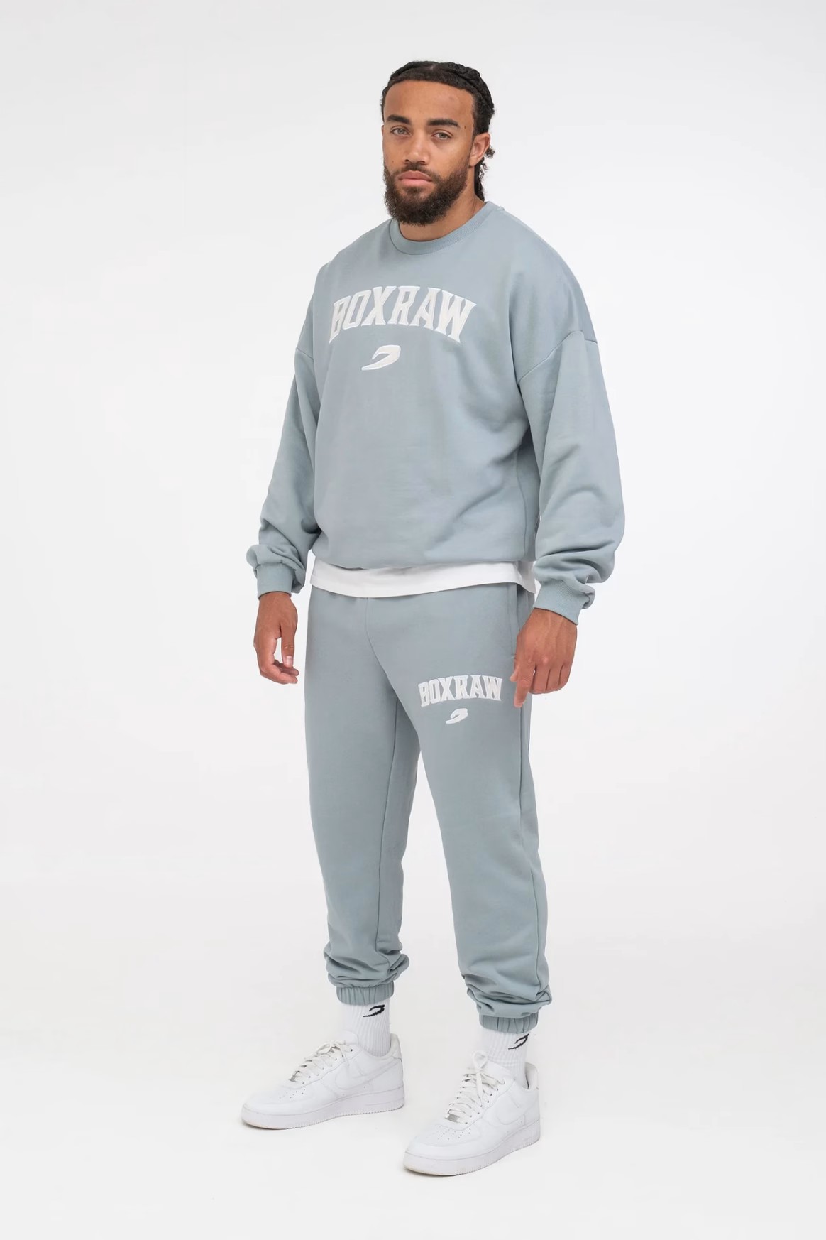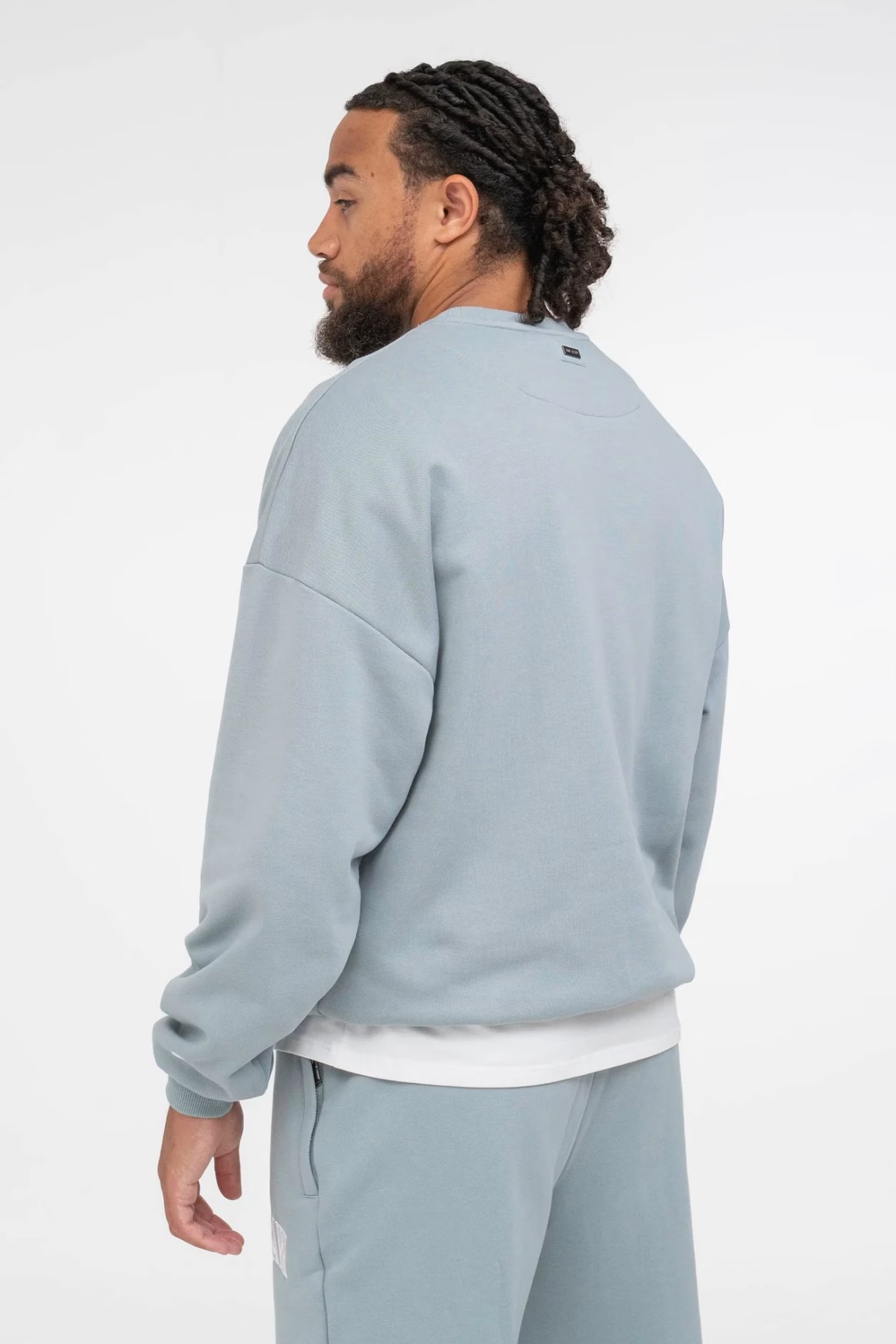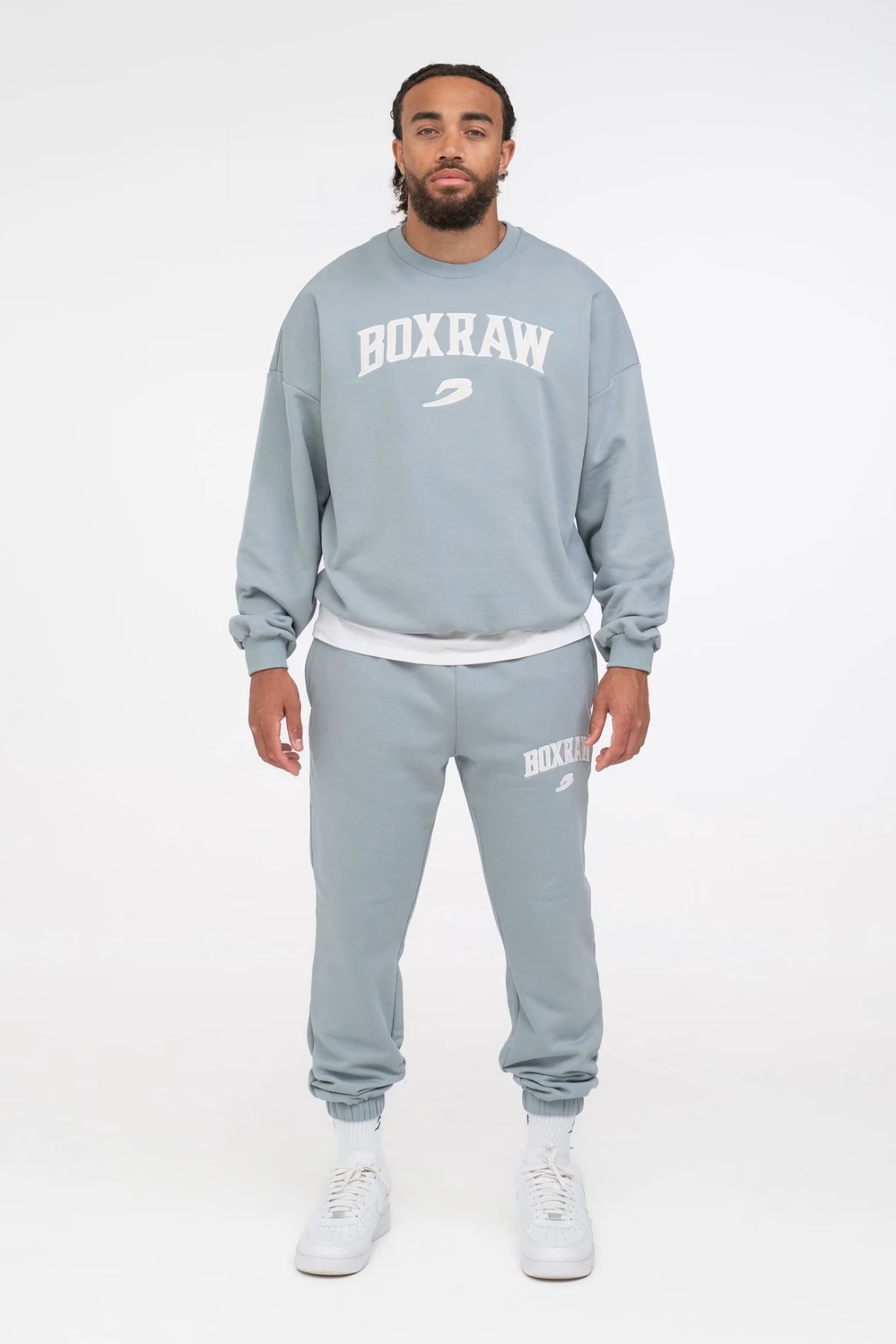 파우더 블루 스웻셔츠를 착용한 모델: CJ (프로 웰터급 복서), 신장: 180cm, 모델 착용 사이즈: M