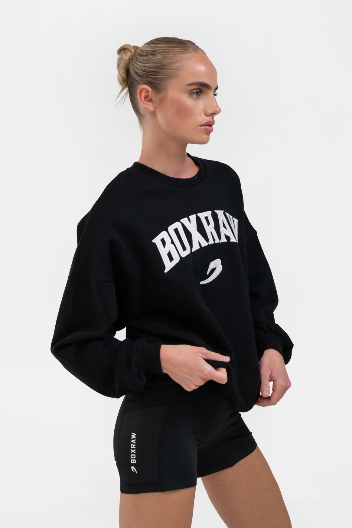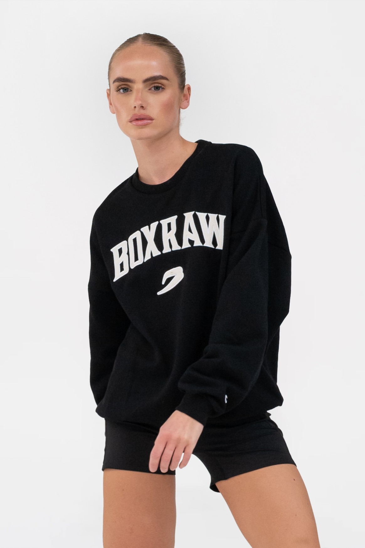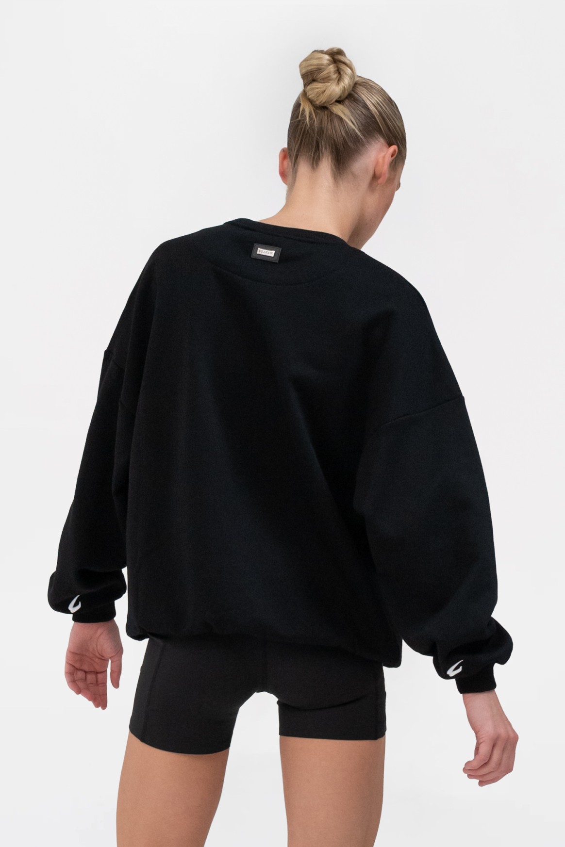 블랙 스웻셔츠를 착용한 모델 신장: 165cm, 모델 착용 사이즈: XS