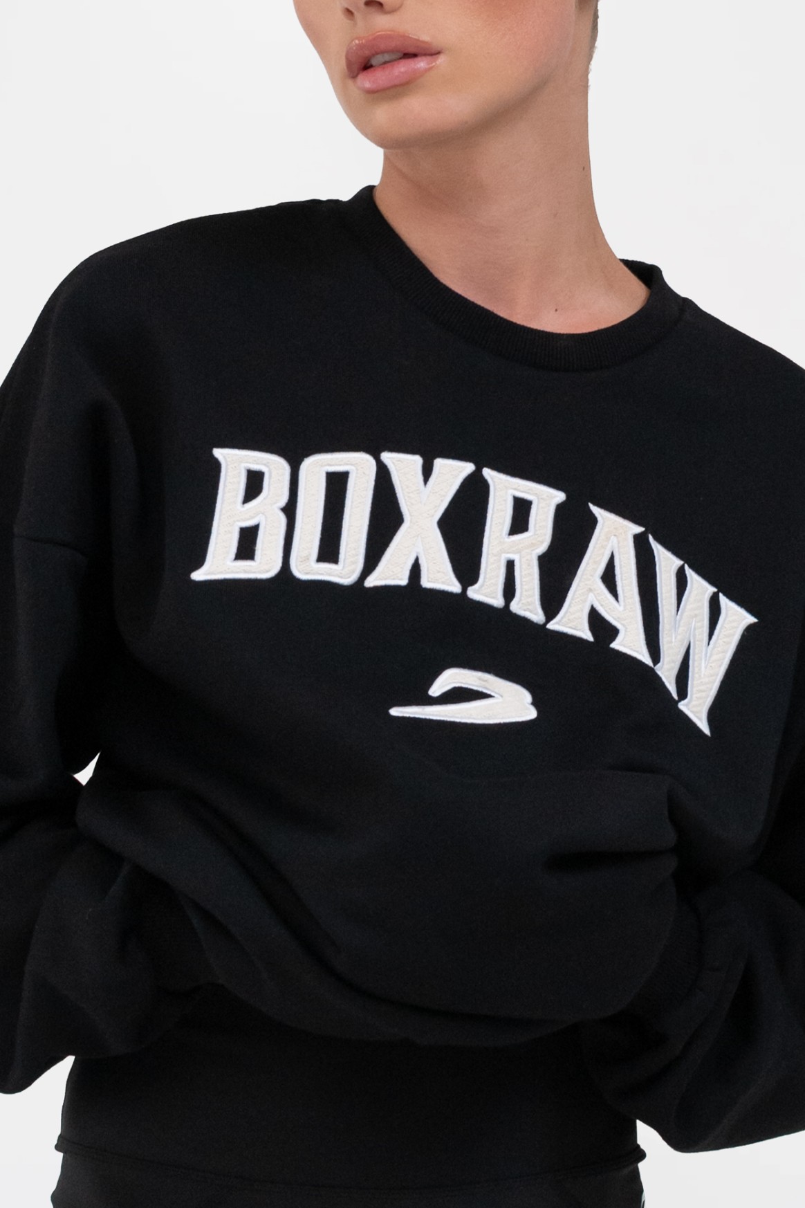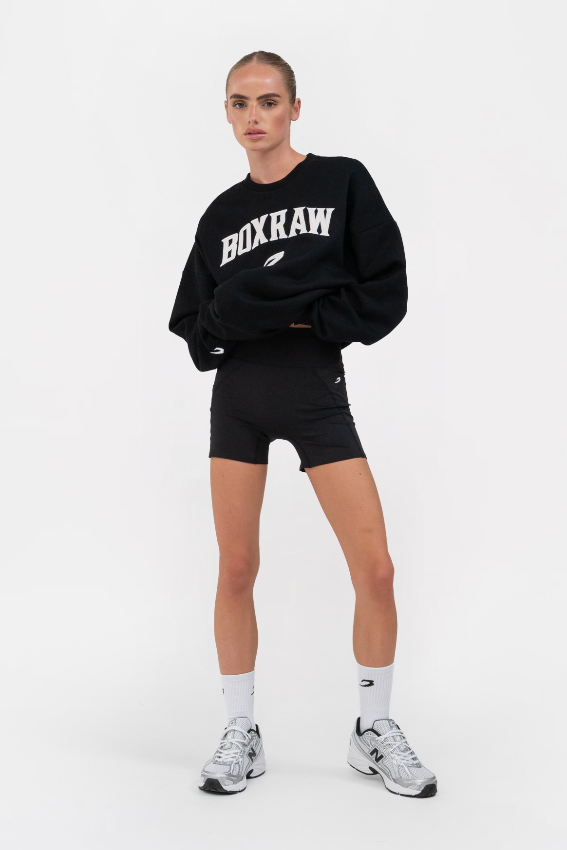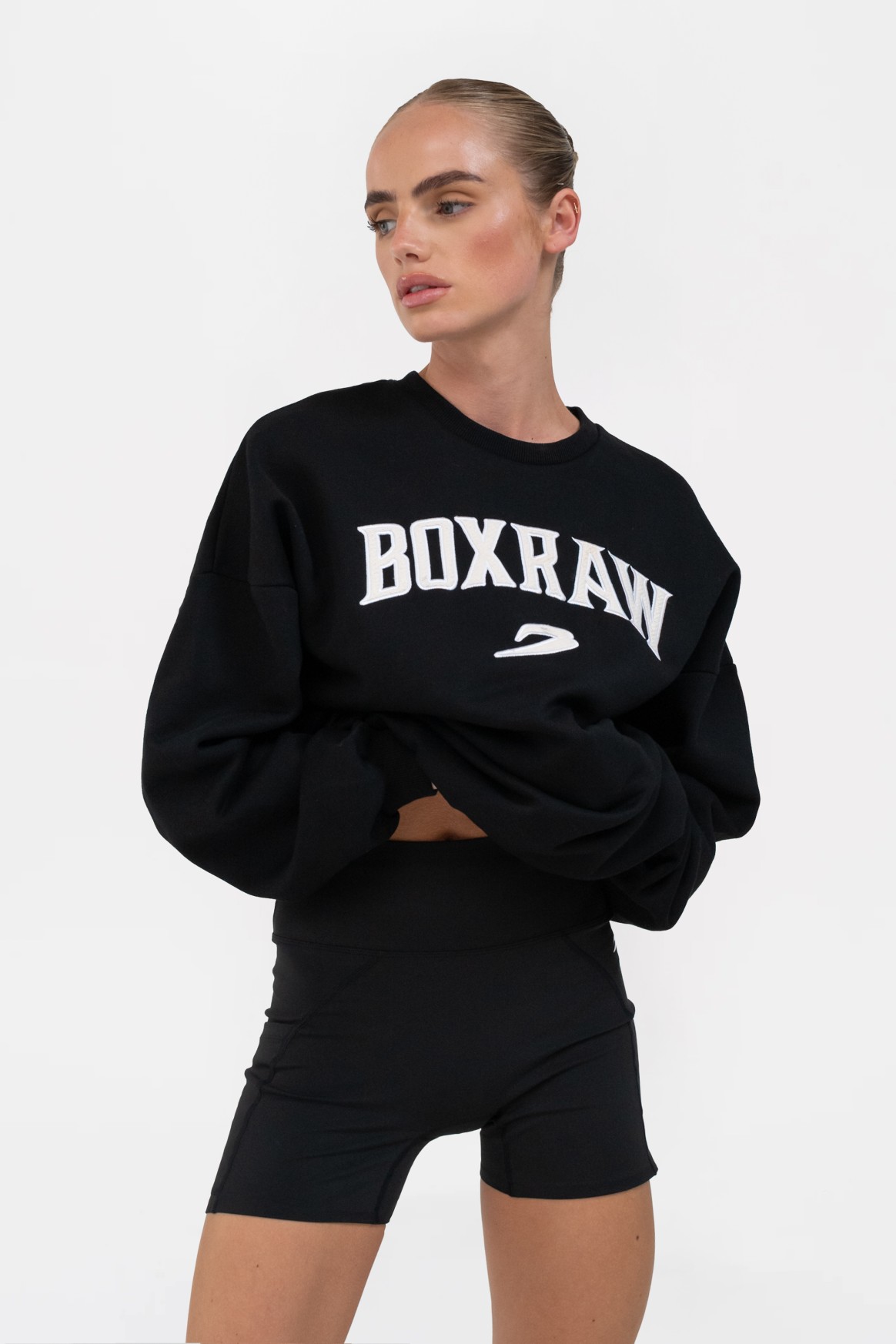 블랙 스웻셔츠를 착용한 모델 신장: 165cm, 모델 착용 사이즈: XS