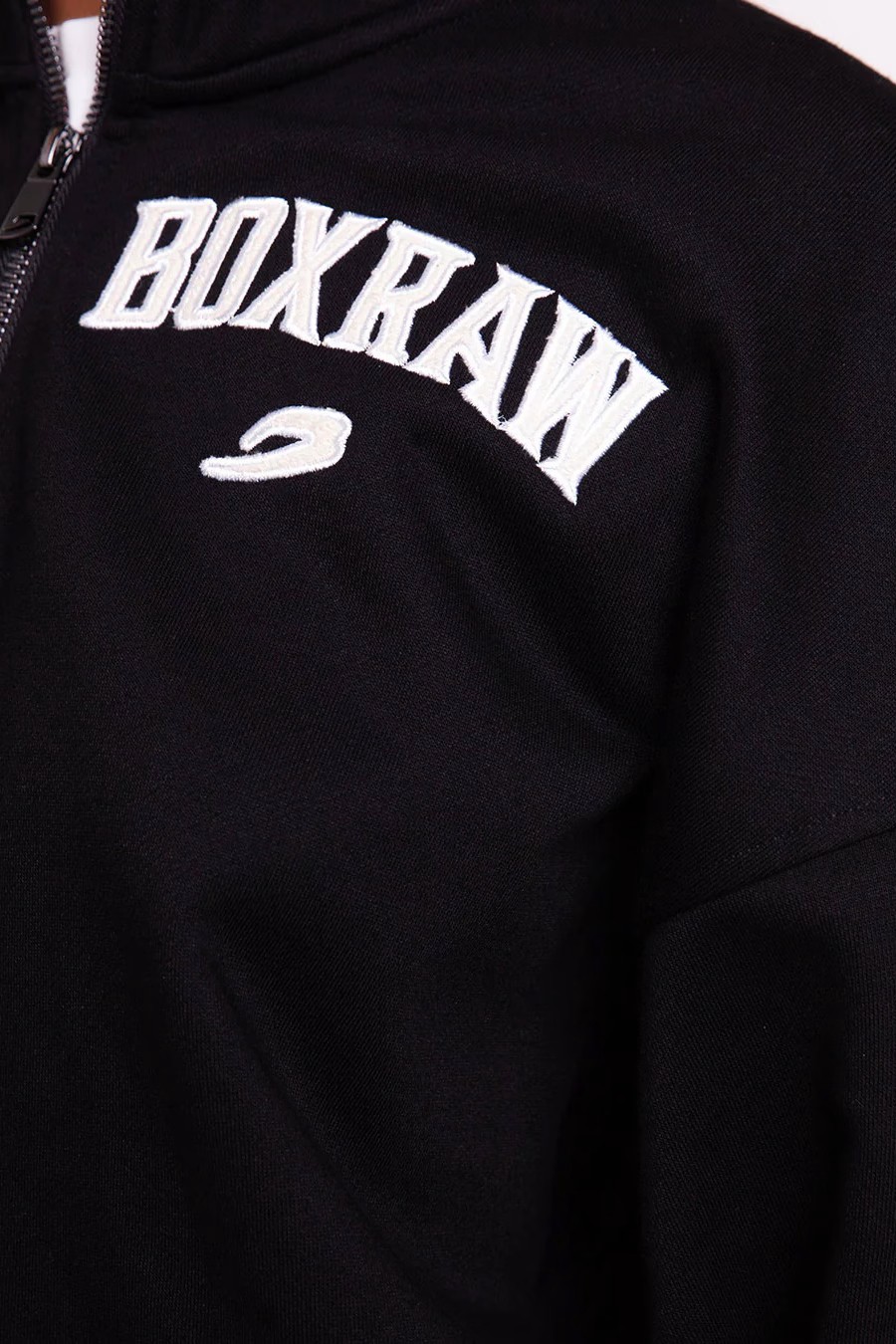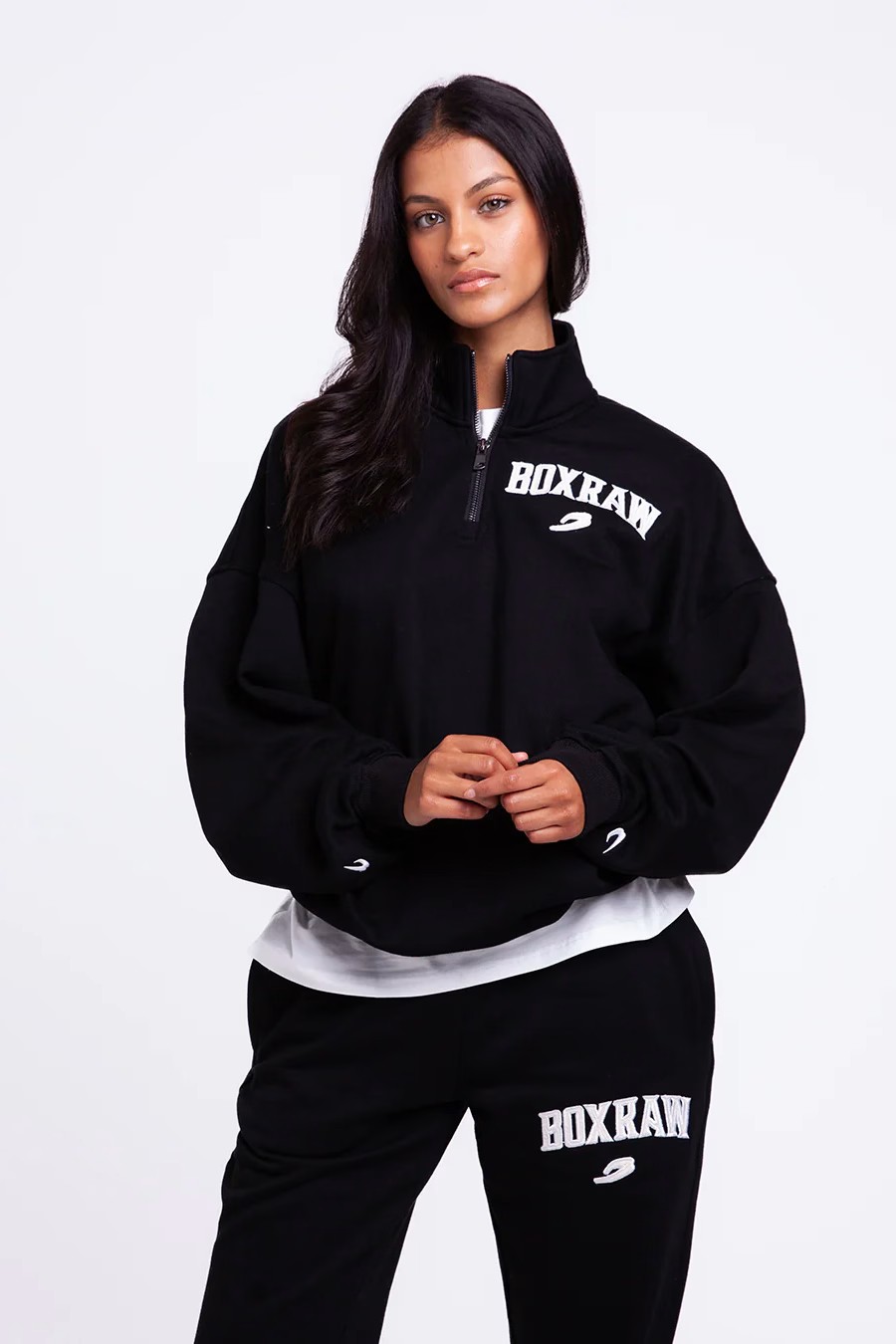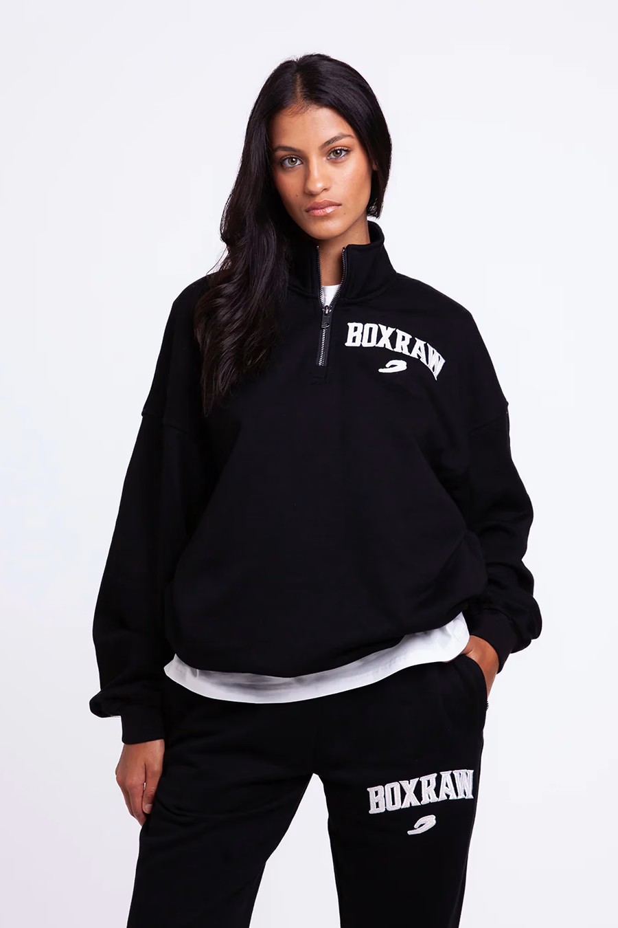 가볍고 내구성 높은 면소재와 부드러운 플리스 안감으로 제작되어 편안한 오버사이즈 핏을 제공합니다. 1/4 지퍼 디자인으로 착용과 활동이 더욱 자유로우며 가슴에는 BOXRAW 아플리케 배지 바시티 로고가 포인트로 들어가 있습니다.