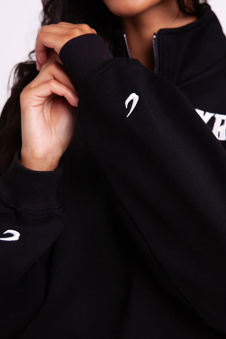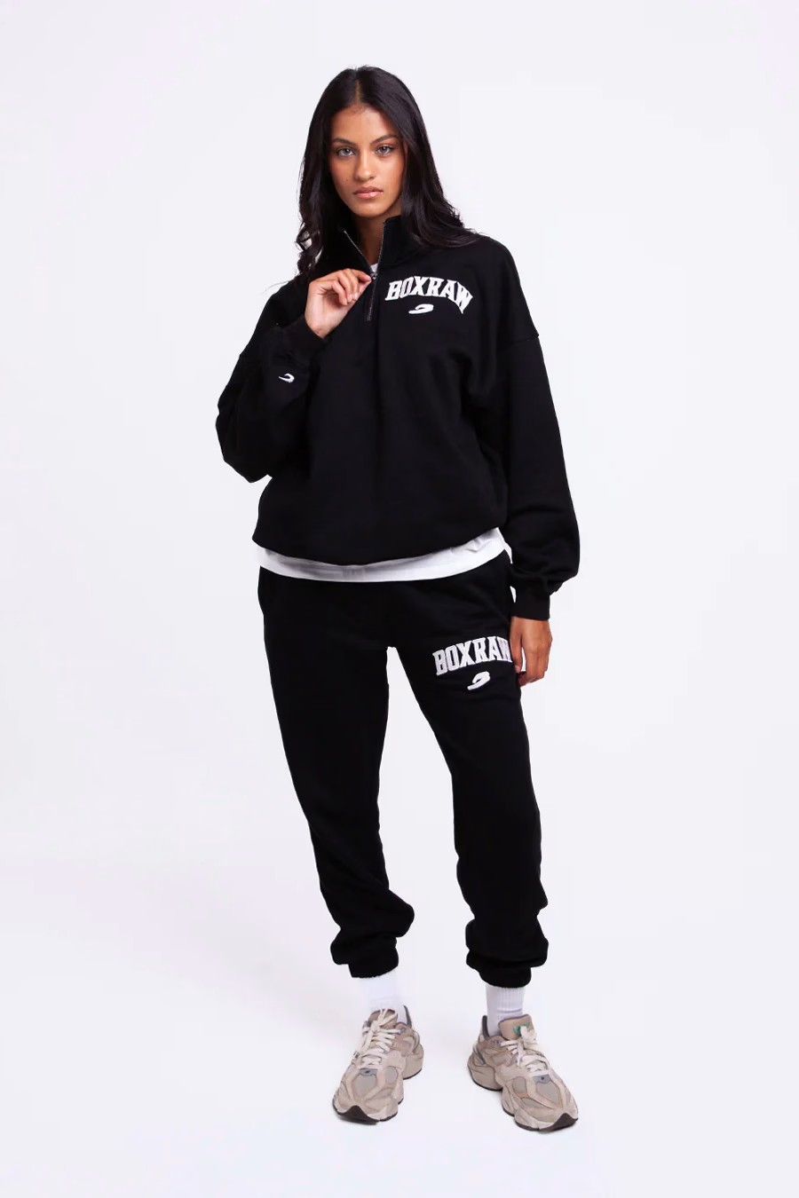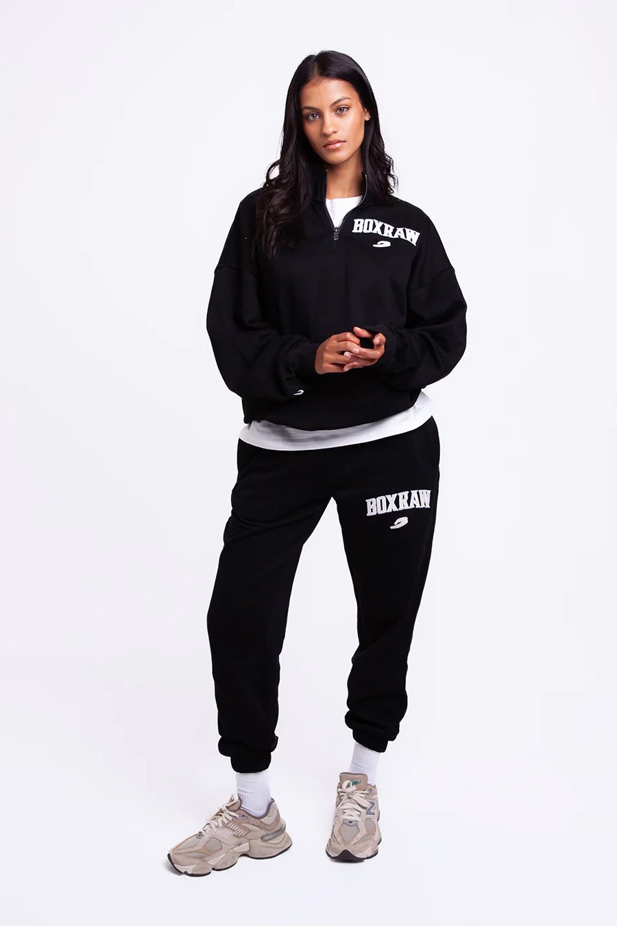 가볍고 내구성 높은 면소재와 부드러운 플리스 안감으로 제작되어 편안한 오버사이즈 핏을 제공합니다. 1/4 지퍼 디자인으로 착용과 활동이 더욱 자유로우며 가슴에는 BOXRAW 아플리케 배지 바시티 로고가 포인트로 들어가 있습니다.