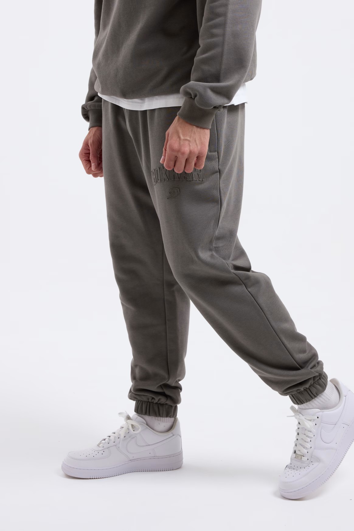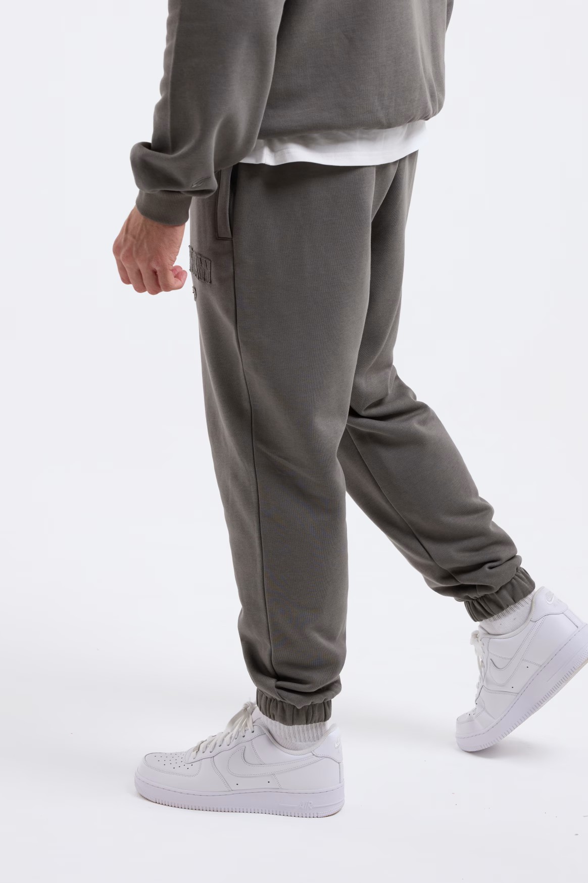 디스트레스드 그레이 조거팬츠를 착용한 모델: 프랭키 (프로 웰터급 복서), 신장: 182cm, 모델 착용 사이즈: L