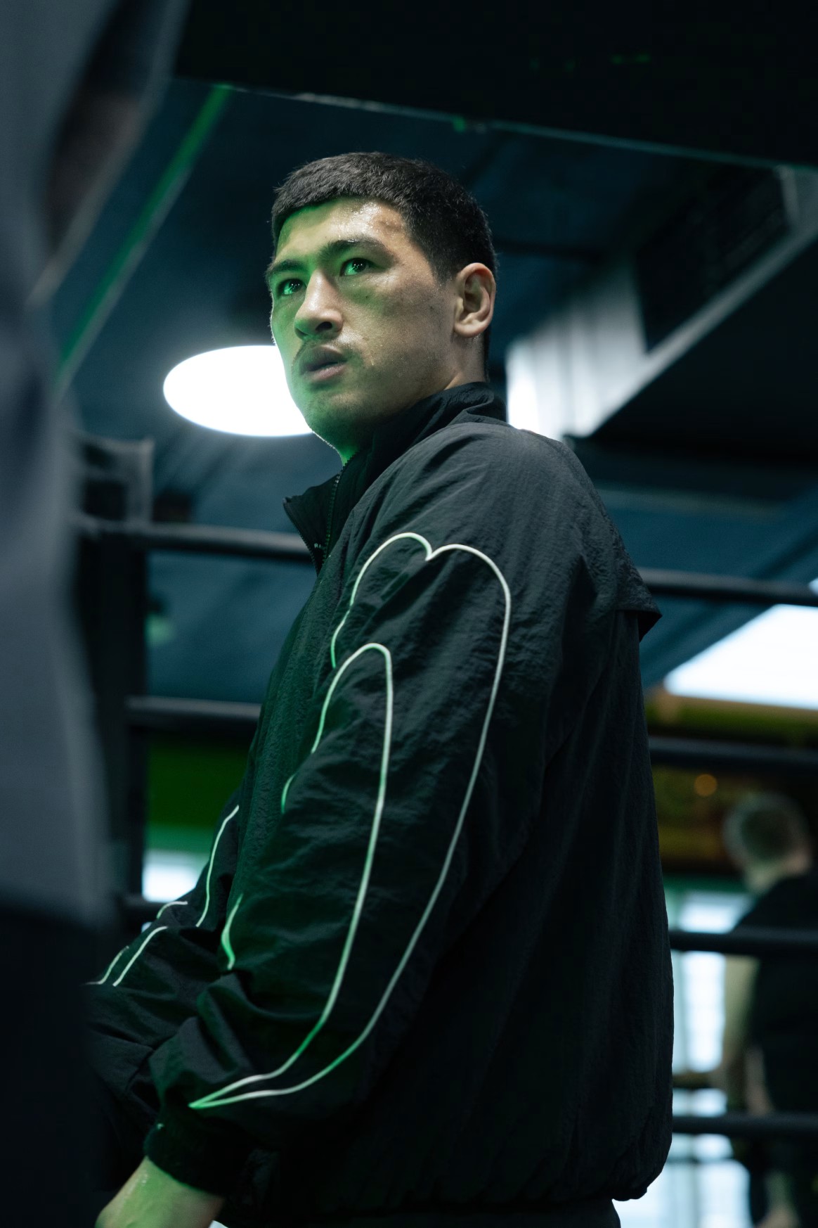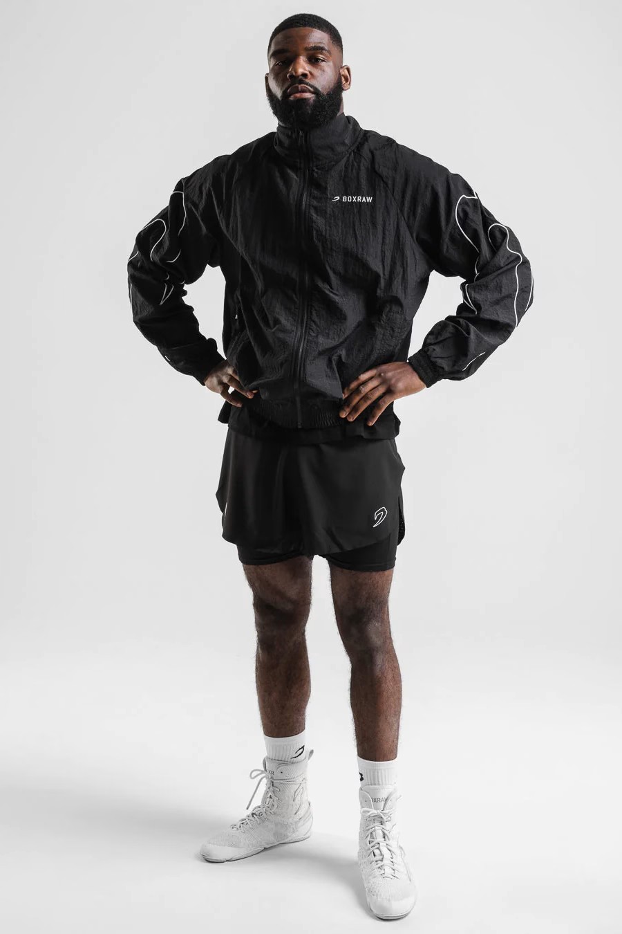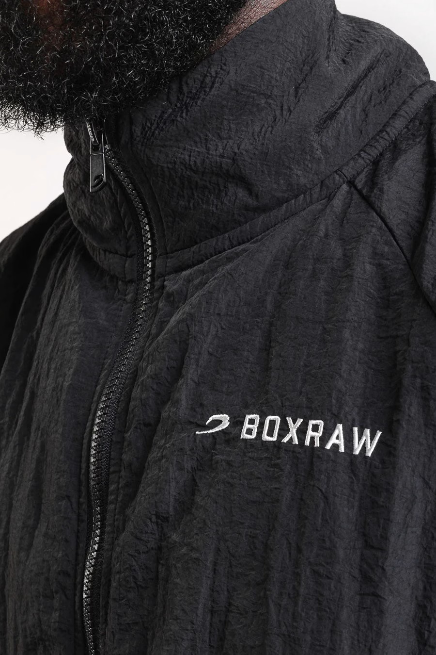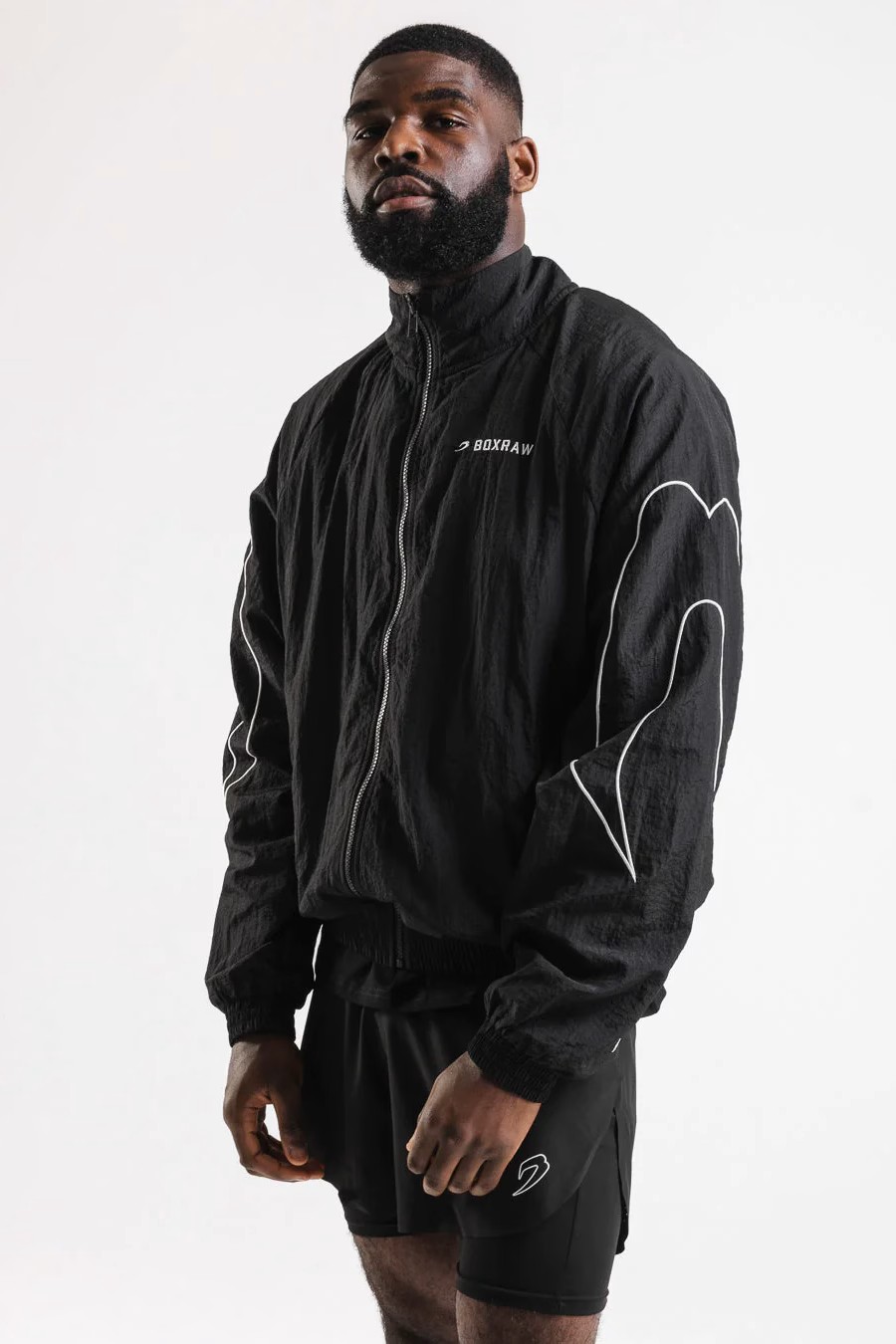 블랙 재킷을 착용한 모델: 엘리엇 (아마추어 라이트헤비급 복서), 신장: 190cm, 모델 착용 사이즈: L