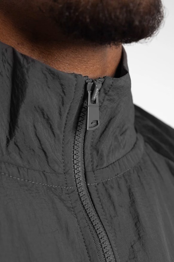 그레이/블랙 재킷을 착용한 모델: 에즈라 (프로 헤비급 복서), 신장: 188cm, 모델 착용 사이즈: L