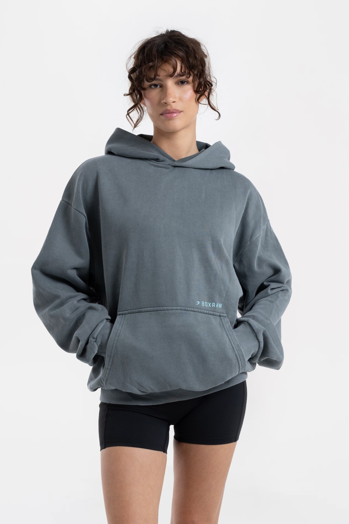 워시드 블랙 후디를 착용한 모델: 168cm, 모델 착용 사이즈: XS