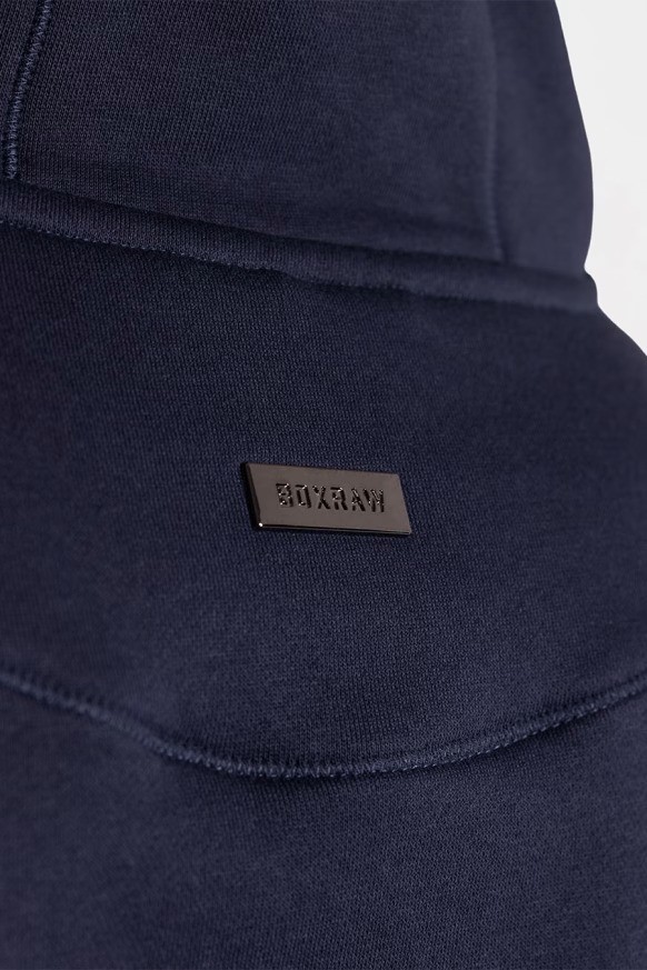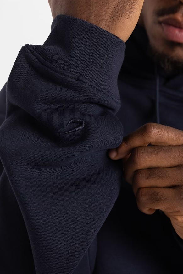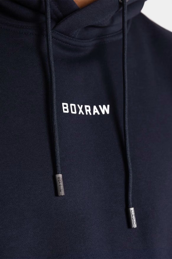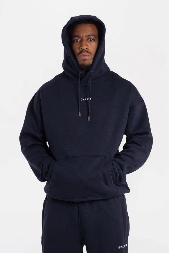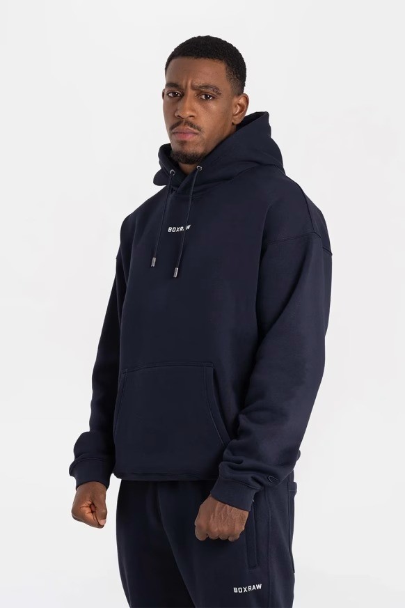 네이비 후디를 착용한 모델: 에즈라 (프로 헤비급 복서), 신장: 188cm, 모델 착용 사이즈: L