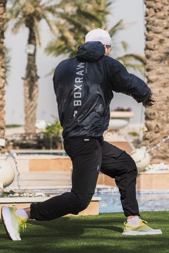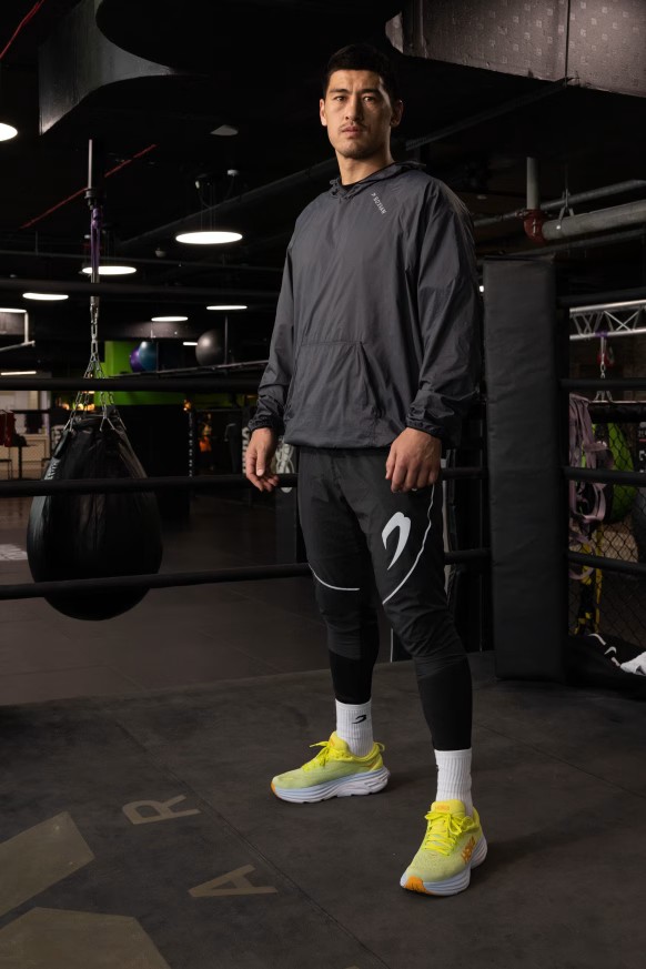 차콜, 네온 옐로우 후디를 착용한 모델: 테일러 (아마추어 라이트헤비급 복서), 신장: 180cm, 모델 착용 사이즈: L