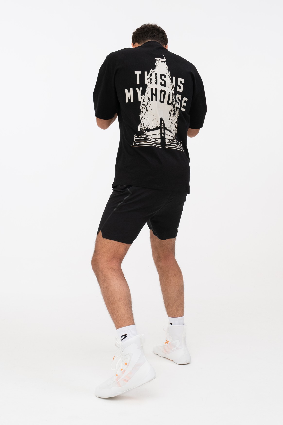 이 티셔츠는 포기를 모르는 분들을 위해 제작되었습니다. 내구성과 신축성이 뛰어난 면소재와 오버사이즈 핏이 어우러져 편안함과 자유로운 움직임을 선사합니다. 뒷면에는 "THIS IS MY HOUSE"라는 문구가 밝은 그래픽 프린트로 새겨져 있어, 경기 시작을 알리는 종이 울릴때 이곳의 주인은 바로 당신이라는 메시지를 전달합니다.