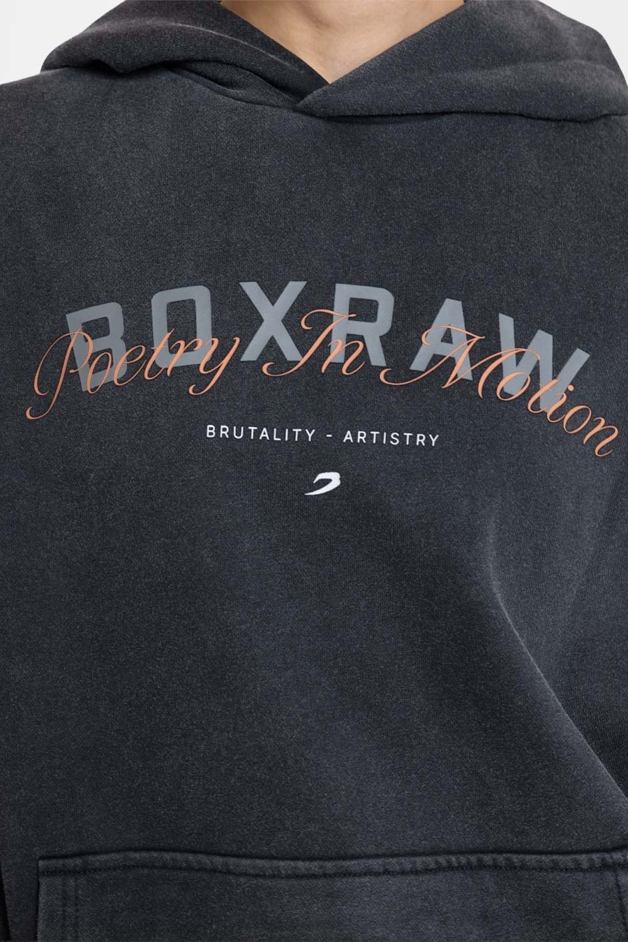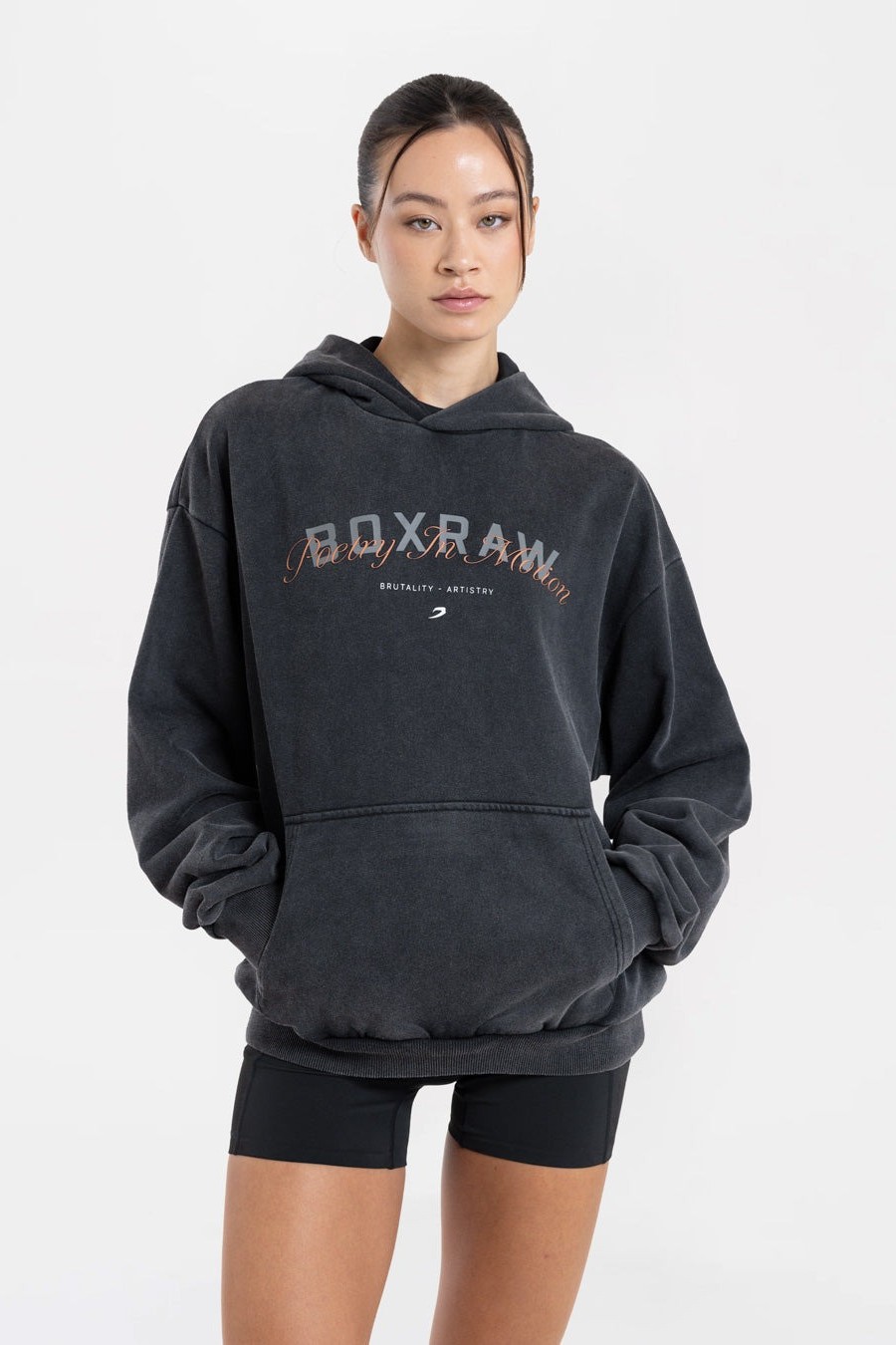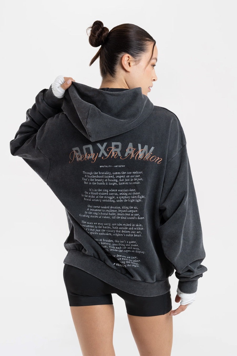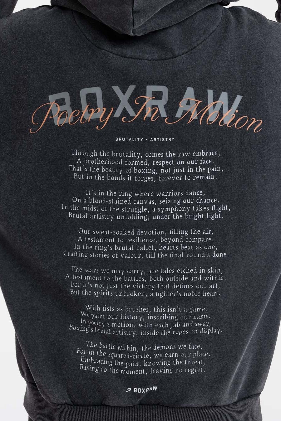 내구성 높은 신축성 코튼 소재로 제작된 이 오버사이즈 후디는 등 부분에 'Brutality - Artistry'라는 시에서 따온 문구가 새겨져 있습니다.