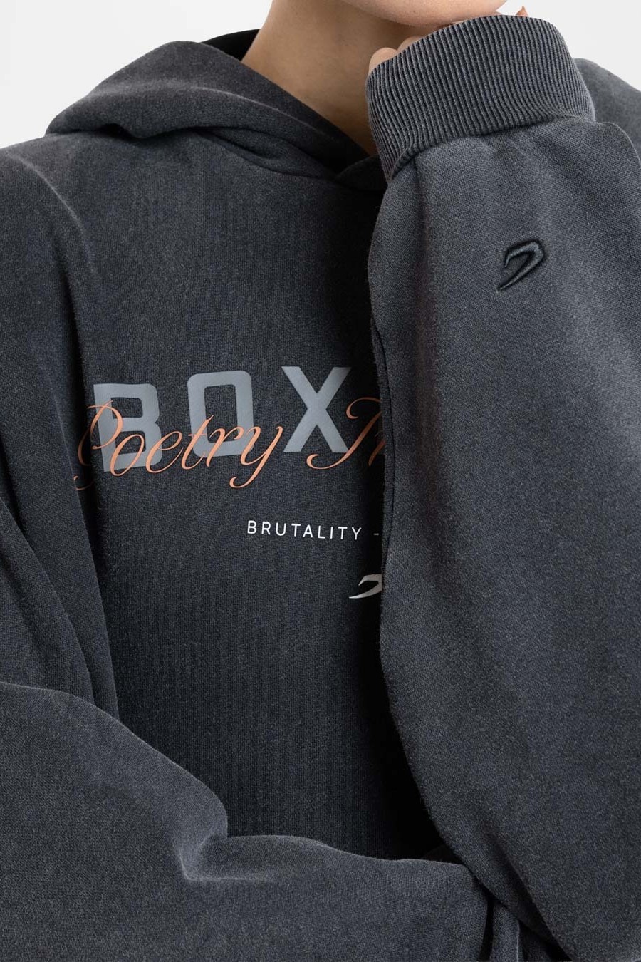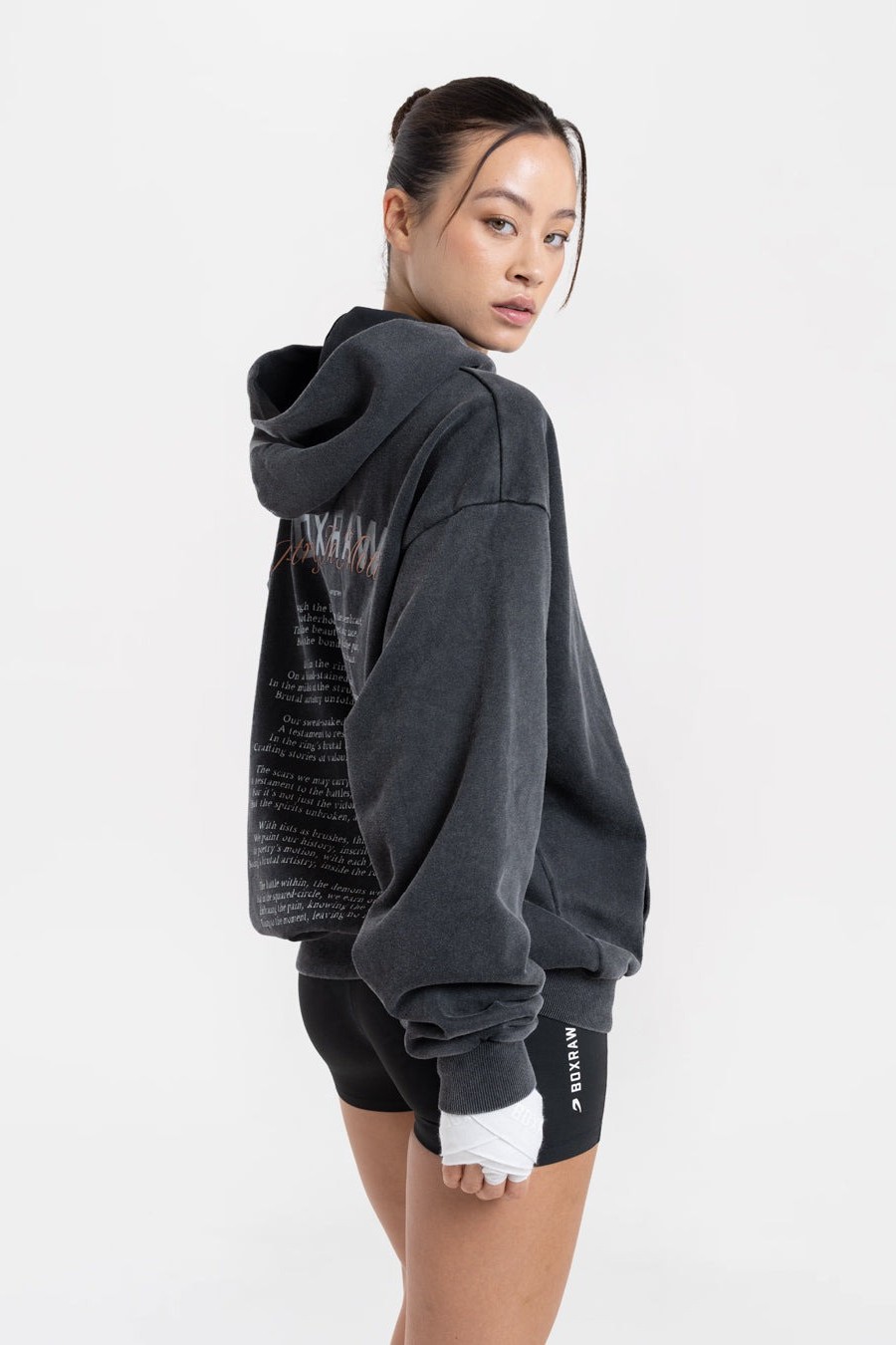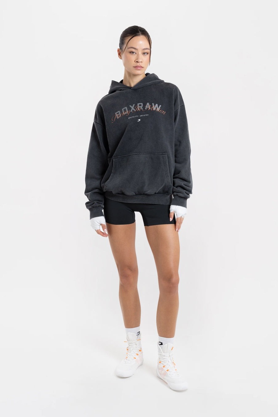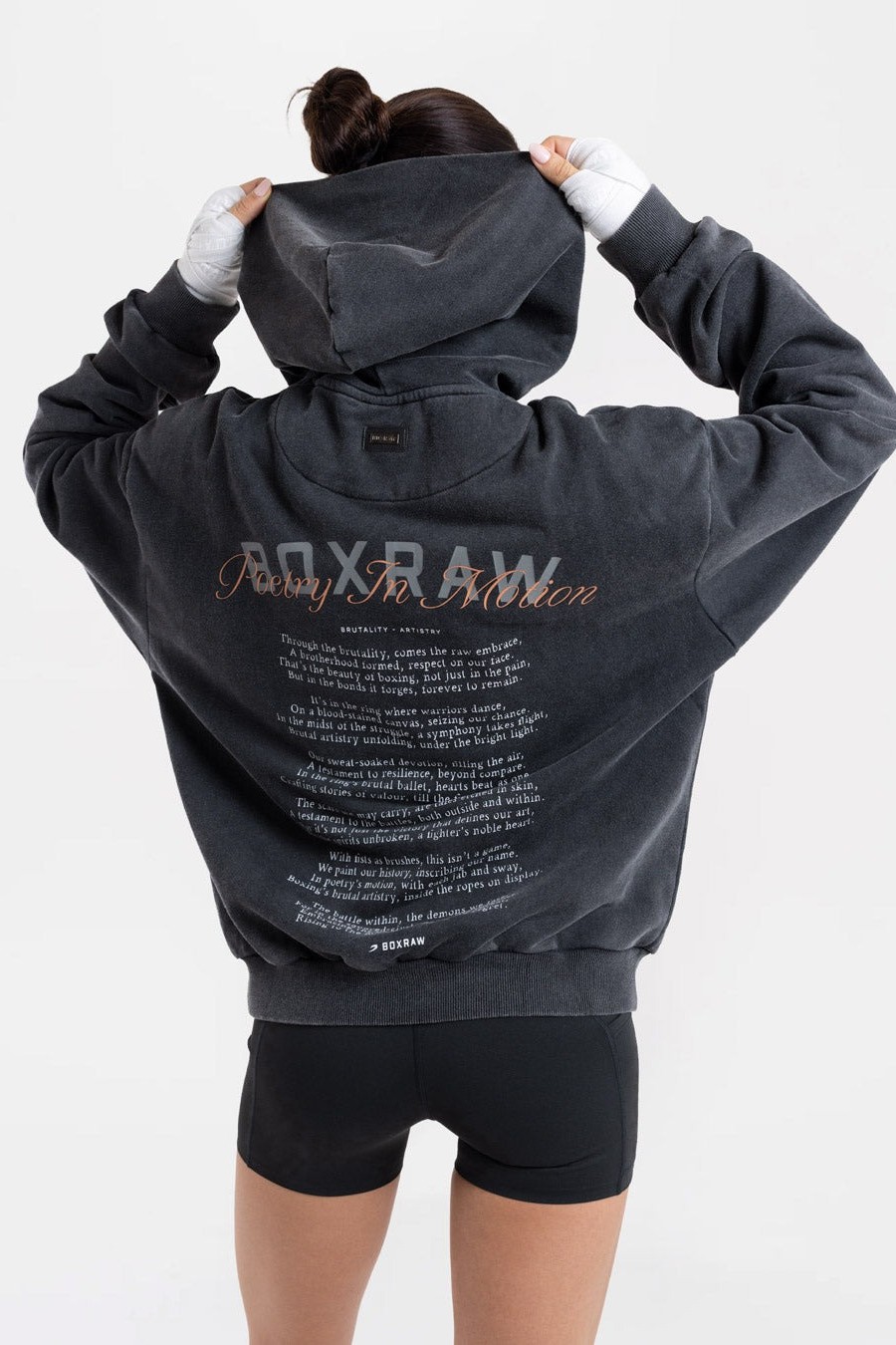 내구성 높은 신축성 코튼 소재로 제작된 이 오버사이즈 후디는 등 부분에 'Brutality - Artistry'라는 시에서 따온 문구가 새겨져 있습니다.