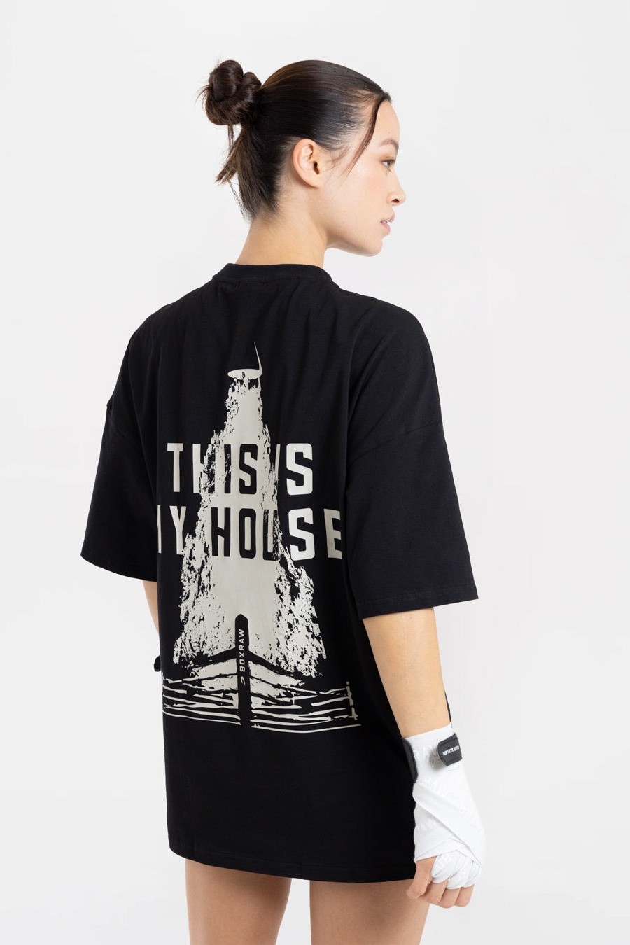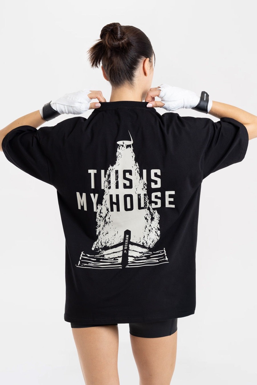 이 티셔츠는 포기를 모르는 분들을 위해 제작되었습니다. 내구성과 신축성이 뛰어난 면소재와 오버사이즈 핏이 어우러져 편안함과 자유로운 움직임을 선사합니다. 뒷면에는 "THIS IS MY HOUSE"라는 문구가 밝은 그래픽 프린트로 새겨져 있어, 경기 시작을 알리는 종이 울릴때 이곳의 주인은 바로 당신이라는 메시지를 전달합니다.